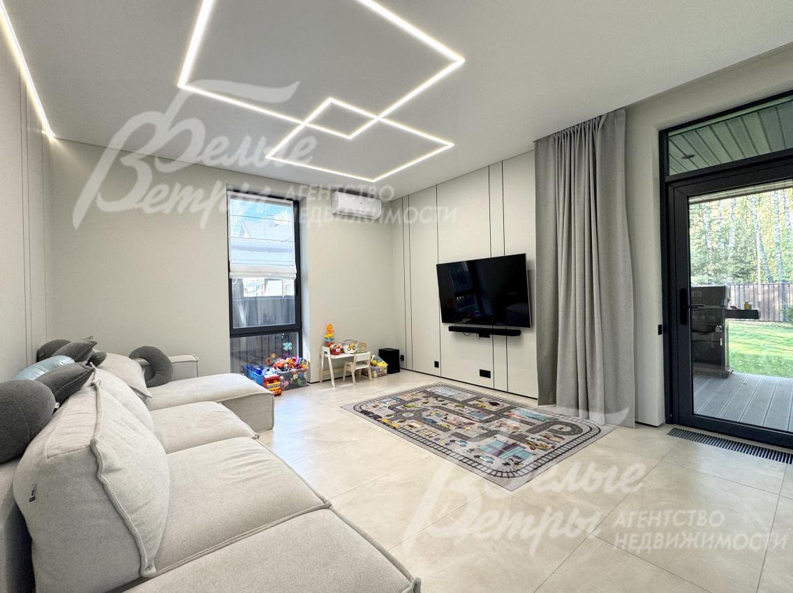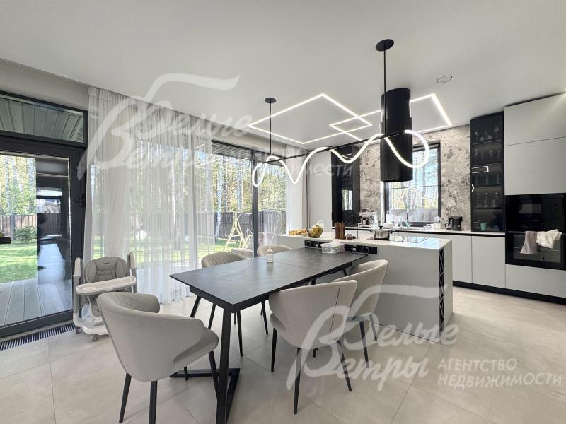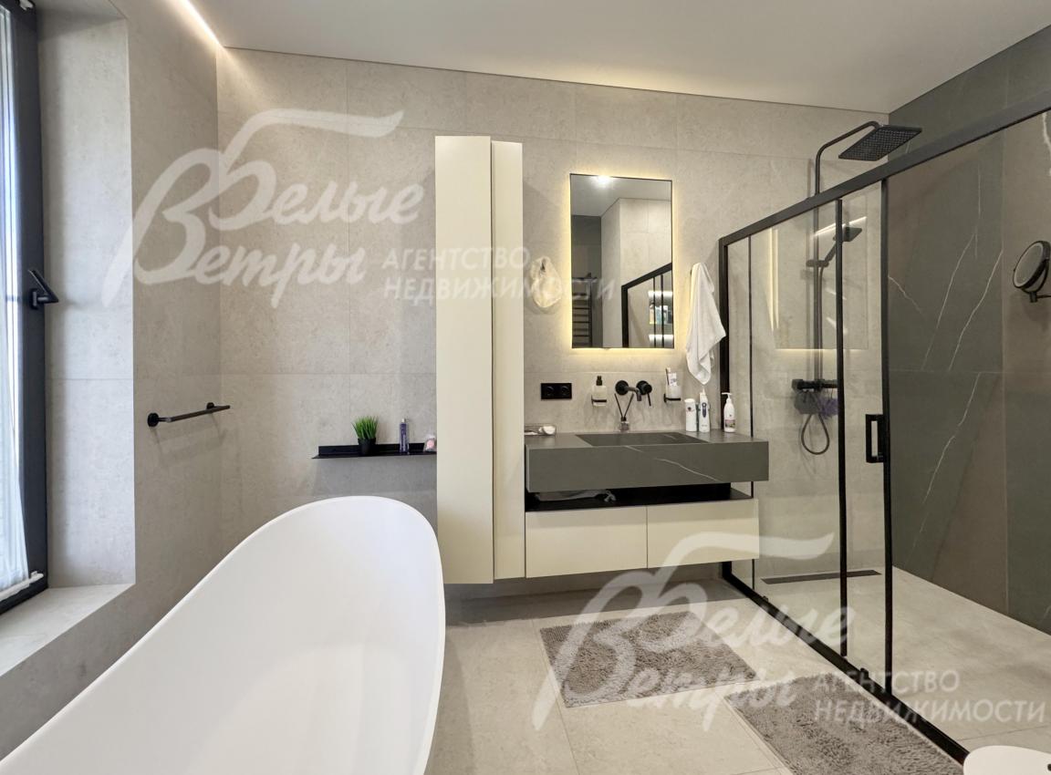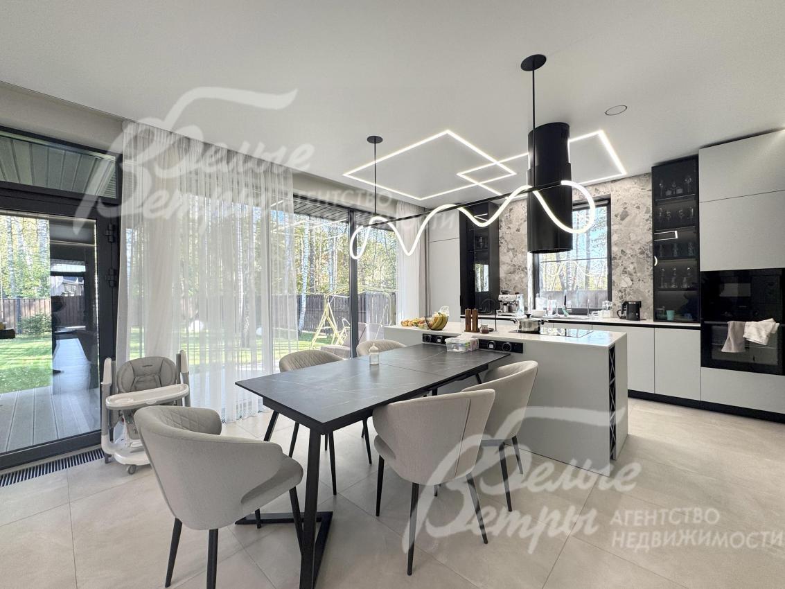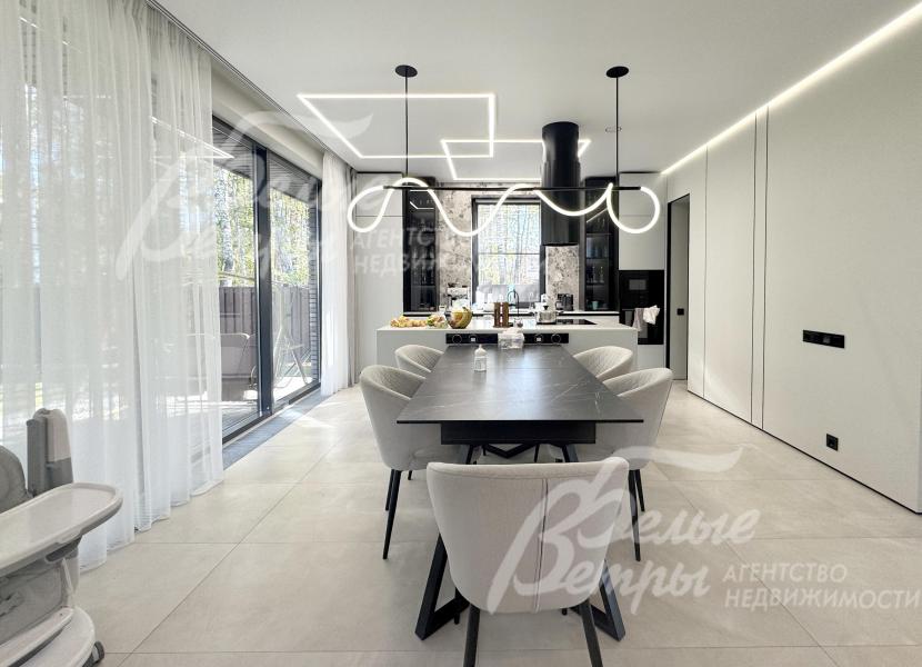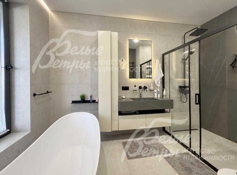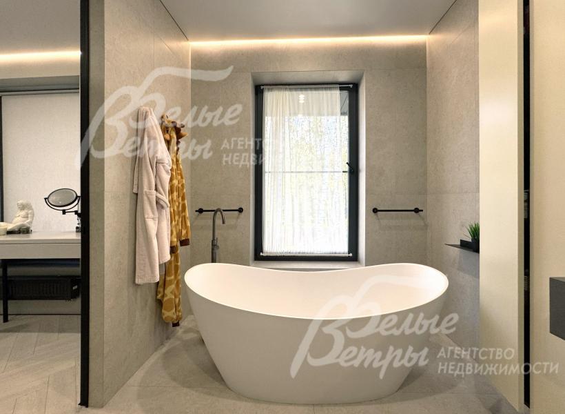Мебель, оборудование: дом полностью меблирован и оснащён техникой. На кухне – гарнитур в трендовом цветовом решении с островом («Стильные Кухни»), столовая группа, техника: духовой шкаф, микроволновая печь, варочная плита, посудомоечная машина, встроенный холодильник Gorenje. В гостиной – большой диван, в спальнях – спальные гарнитуры, телевизоры, системы хранения в гардеробных. Есть стиральная и сушильная машины. В санузлах – встроенные душевые уголки, раковины, водяные полотенцесушители, безободковые унитазы, мебель, выполненная на заказ, в санузле мастер-спальни – отдельностоящая ванна из литьевого мрамора