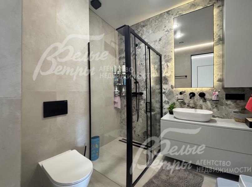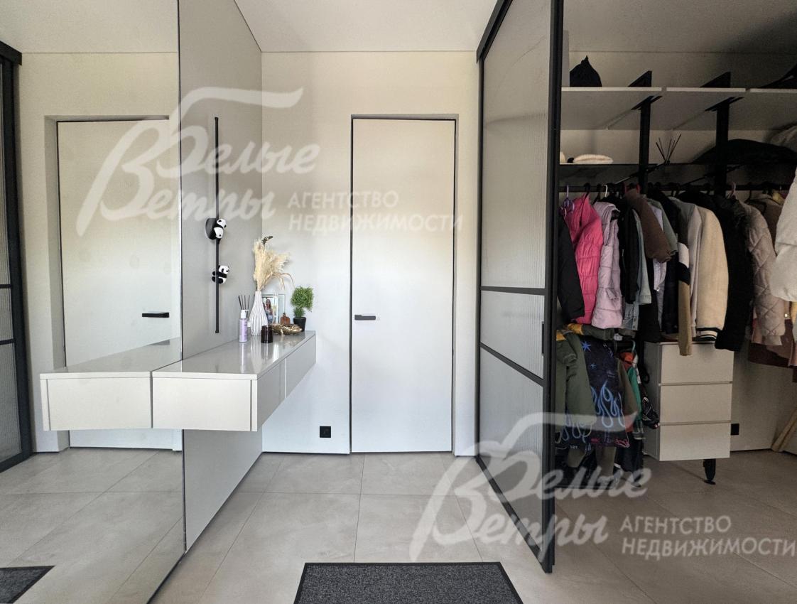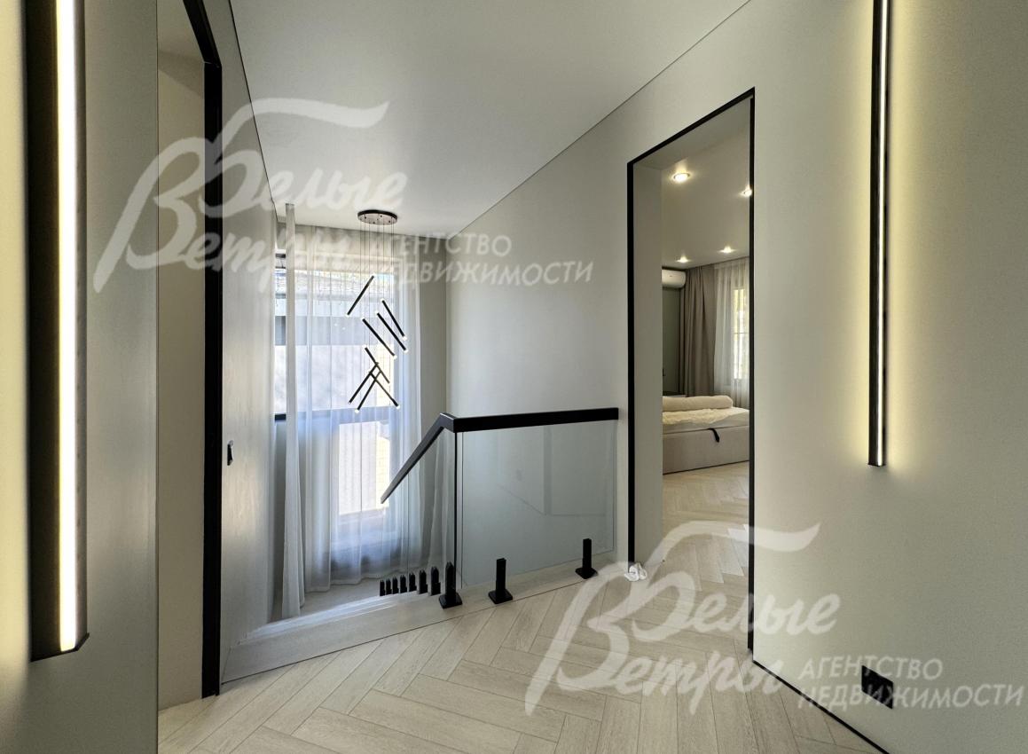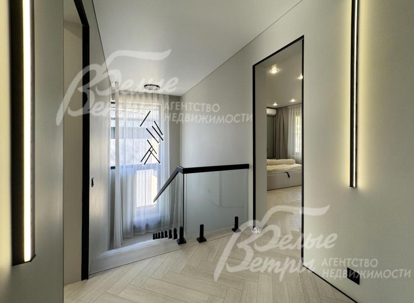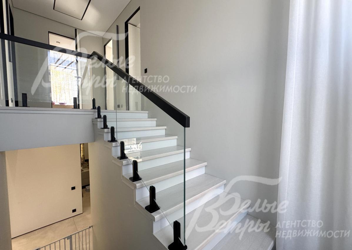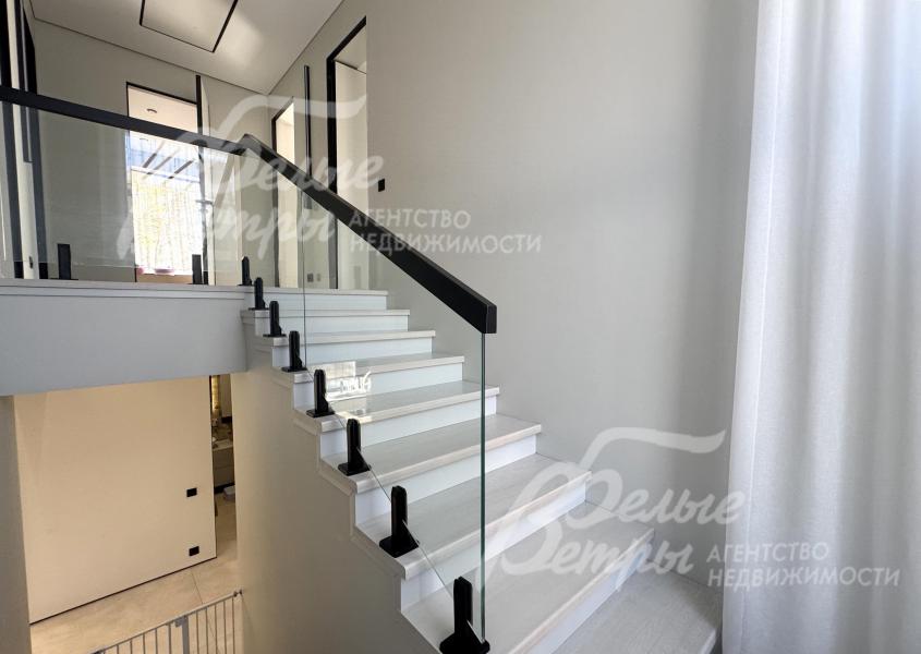 Описание внутренней отделки: интерьер оформлен в стиле минимализма – в цветовой гамме доминируют светлые холодные тона. Отделка стен включает трёхслойную шпатлёвку, армирующий стеклохолст и финишное покрытие моющейся краской Dulux Bindo 7, стены санузлов оформлены керамогранитом – стильно скомбинированы варианты современных дизайнеров. На полу – керамогранит Италон и кварцвинил НоmеЕхреrt. Потолок – натяжной, со световыми линиями и скрытым карнизом: реализовано несколько сценариев освещения; на кухне – люстра, есть бра с беспроводной зарядкой. Установлены стальные панельные радиаторы Кеrmi, проходные выключатели со стеклянной рамкой, автоматическое управление шторами, межкомнатные двери скрытого монтажа, входная дверь из тёплого алюминия со стеклопакетом черного цвета и электронным замком "hottel slim" (вход – по отпечатку пальца, интегрирован с «Умным домом»). На второй этаж ведёт монолитная лестница со ступенями, отделанными деревом, и ограждением из закаленного стекла. На полу всего 1-го этажа и в санузлах 2-го этажа – тёплые полы. Выполнено фасадное освещение дома