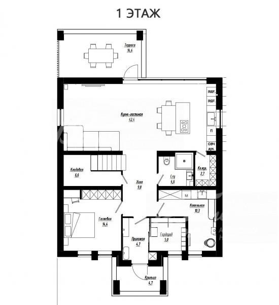 1-ый этаж: крытое крыльцо 4,5 кв.м, прихожая 4,5 кв.м, гардеробная 5 кв.м, холл 10 кв.м, кухня-столовая-гостиная 42 кв.м с выходом на крытую террасу 14,5 кв.м, кладовая при кухне 23 кв.м, спальня 14,5 кв.м, санузел с душевой 6,5 кв.м, котельная 10 кв.м, кладовая (под лестницей) 6,5 кв.м