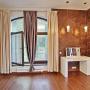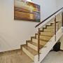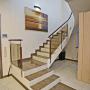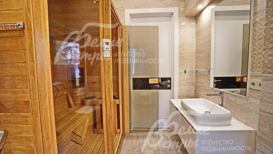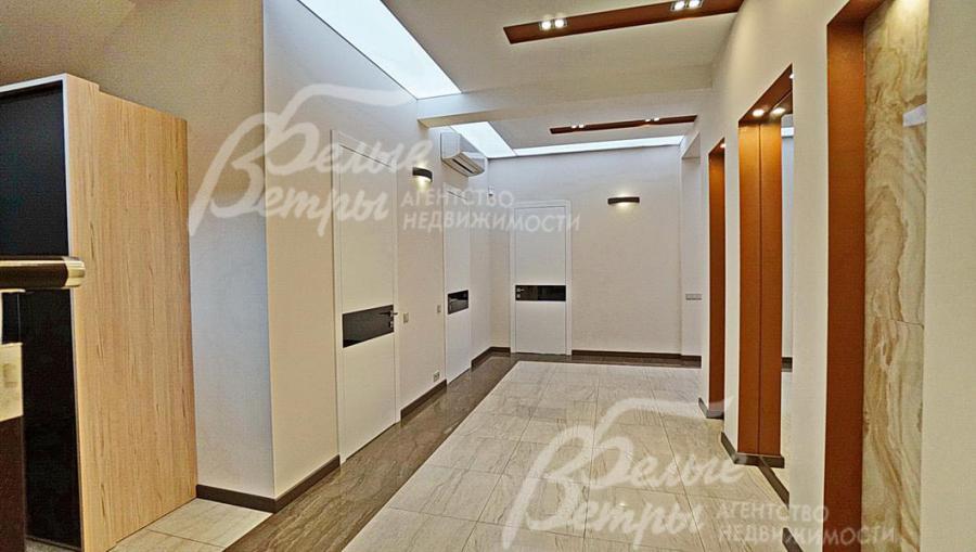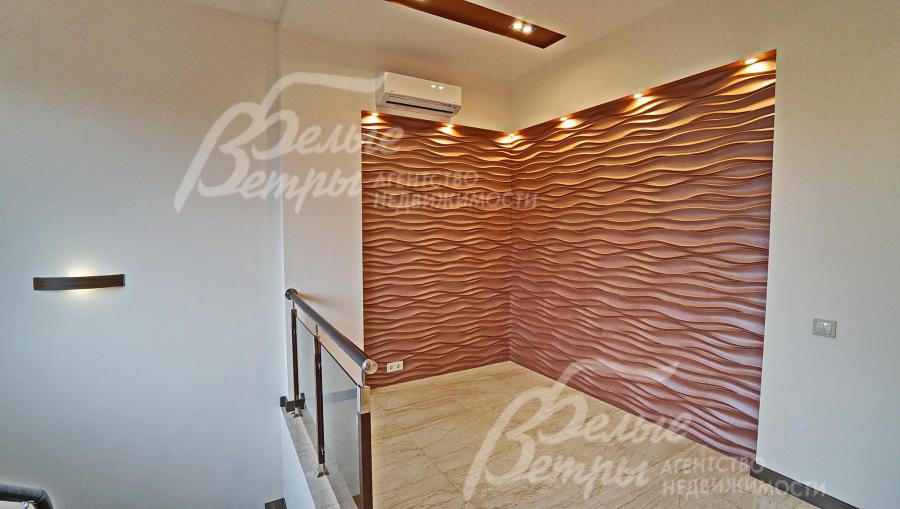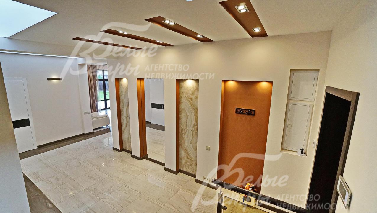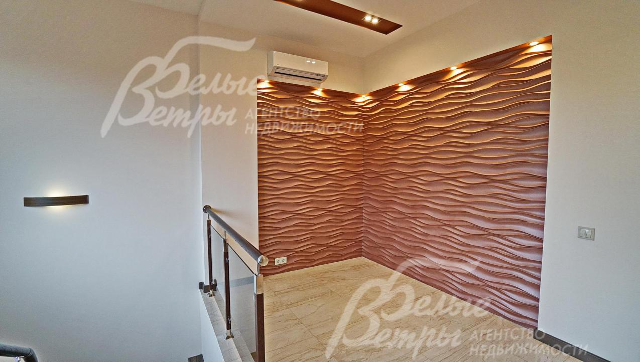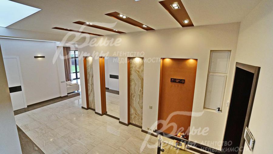 Описание внутренней отделки: дизайнерская отделка; на стенах декоративная штукатурка, в гостиной фреска, в холле 3D панели; проведены теплые водяные полы(весь первый этаж + санузел второго этажа), плитка, паркетная доска; лестничный марш бетон, ограждение стекло, поручни массив дерева с хромированными элементами крепления; потолки ГКЛ со встроенными светильниками, световые фонари; сантехника Laufen, HansChrohe, Radomir, раковина искуственный камень; радиаторы БиМеталл Арбония; двери пр-ва Италия;