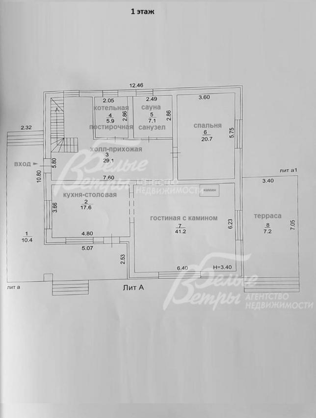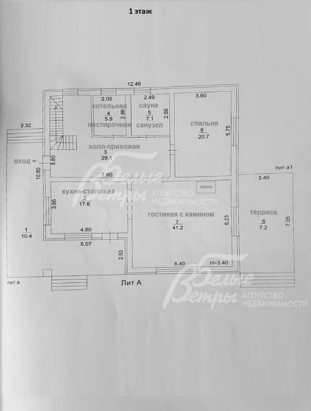 1-ый этаж: гостиная-каминная 41 кв.м с выходом на крытую террасу 24 кв.м, кухня-столовая 17 кв.м с выходом на веранду, спальня 21 кв.м, холл-прихожая 29 кв.м, котельная-постирочная 6 кв.м, сауна с санузлом 7 кв.м;