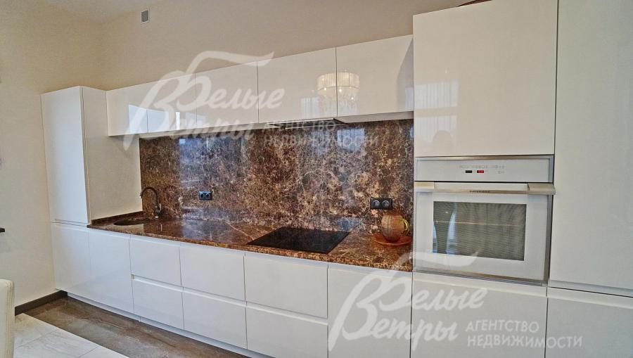 Мебель, оборудование: кухня МДФ (гладкая белая Европрестиж) столешница и фартук - мрамор, техника Kuppersberg, столовый гарнитур