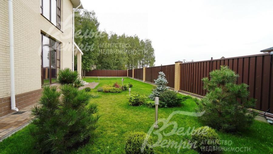 На участке обустроен газон, уличное освещение и вымощены плиткой дорожки