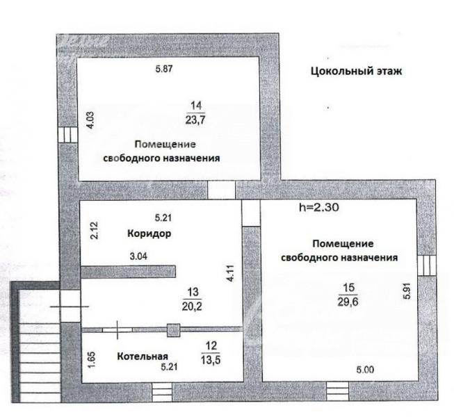 Цоколь: холл 20 кв.м, котельная 13.5 кв.м, 2 помещения свободного назначения 24 кв.м и 29.6 кв.м