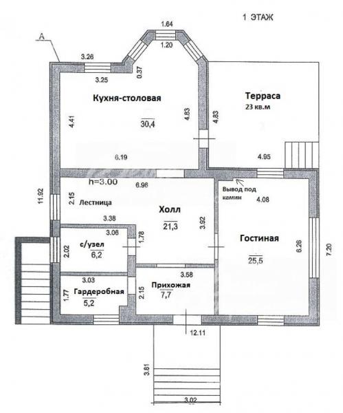 1-ый этаж: крытое крыльцо, прихожая 8 кв.м, гардеробная 5 кв.м, с/узел 6 кв.м, холл 21 кв.м, кухня-столовая 30.5 кв.м с эркером, гостиная 25.5 кв.м с выводом под камин и выходом на террасу 23 кв.м
