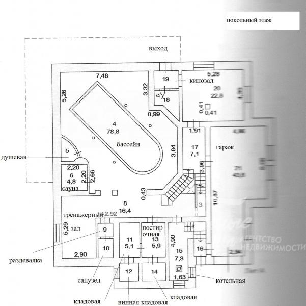 Цоколь: Кинозал 23 кв.м, бассейн 80 кв.м, сауна 5 кв.м, душевая, тренажерный зал 17 кв.м, с/узел, постирочная 6 кв.м, кладовки 5 и 3 кв.м, винная комната 3 кв.м, котельная 7 кв.м, сейфовая комната, технические и вспомогательные помещения, гараж на 2 а/м 43 кв.м.