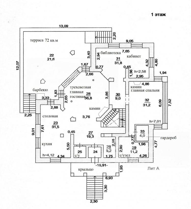 1-ый этаж: Крыльцо 14 кв.м, тамбур 3.5 кв.м, прихожая 5 кв.м, холл 19 кв.м, санузел 3 кв.м, 3-хсветная гостиная 37 кв.м с камином и вторым светом, кухня-столовая 31.5 кв.м с выходом на террасу 70 кв.м с барбекю; спальня 31 кв.м с камином, гардеробной 4 кв.м и с/узлом 11 кв.м; холл 9 кв.м, библиотека-кабинет 32 кв.м