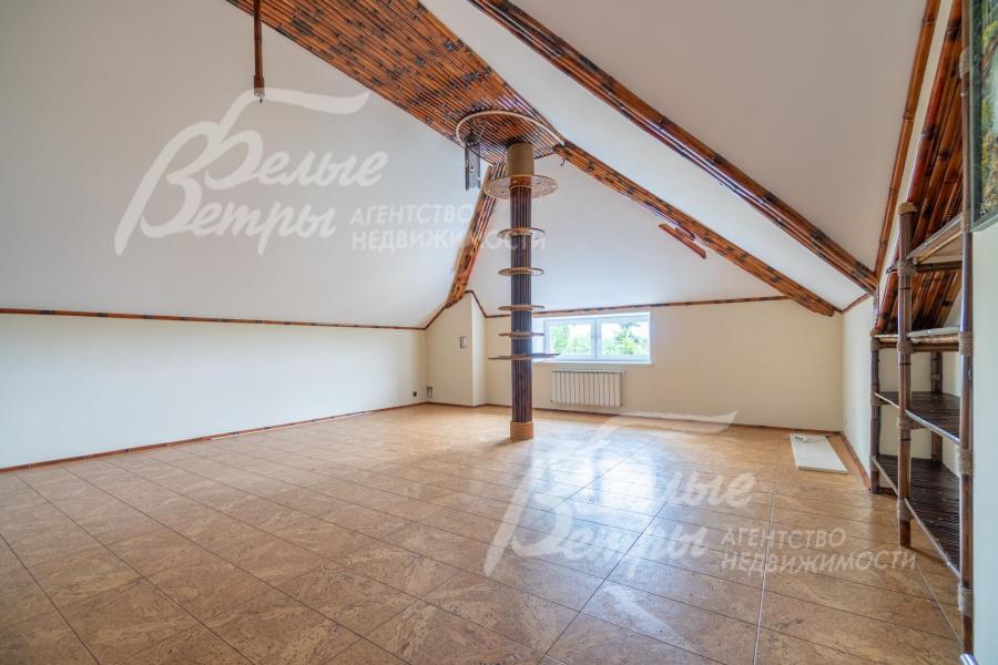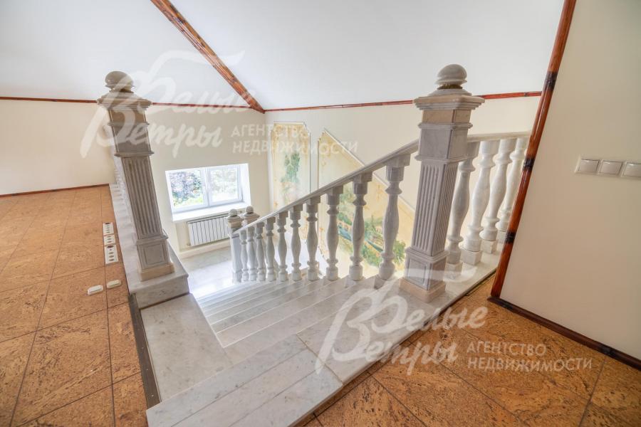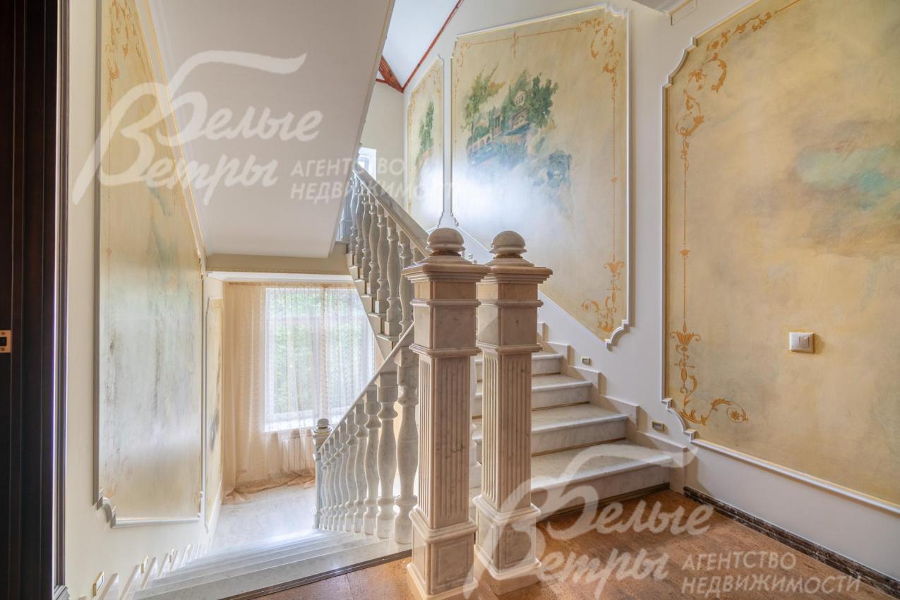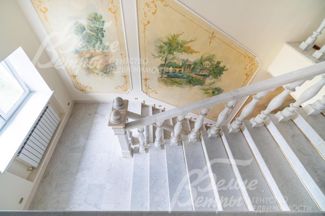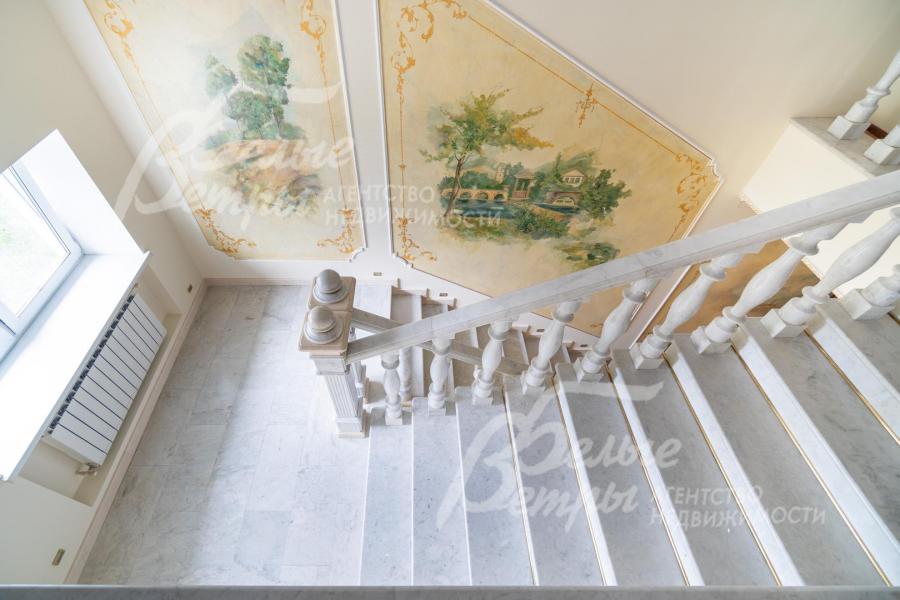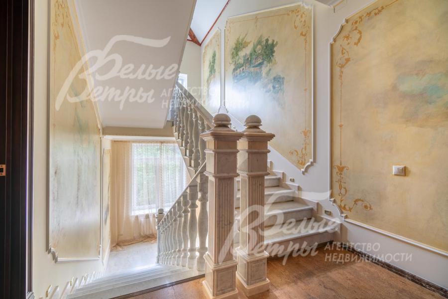 Описание внутренней отделки: выполнена отделка в пастельной гамме из дорогостоящих материалов высокого качества. Стены покрашены в светло-бежевые тона, в коридорах, на лестничных пролётах – панно в классическом стиле и элементы росписи, в спальнях поклеены обои, в санузлах выложена плита, в спортивном зале – крашеные стены, одна стена – зеркальная. На полу 1-го и цокольного этажей – плитка и керамогранит, в холлах 2-го и мансардного этажей – пробка, в спальнях – ламинат, в спортивном зале – ковролин. Потолки из гипсокартона. Установлены двери из массива дерева и подоконники ПВХ. На 2-й и мансардный этажи ведёт бетонная лестница со ступенями из натурального мрамора бело-серого оттенка. Гостиную украшает угловой камин