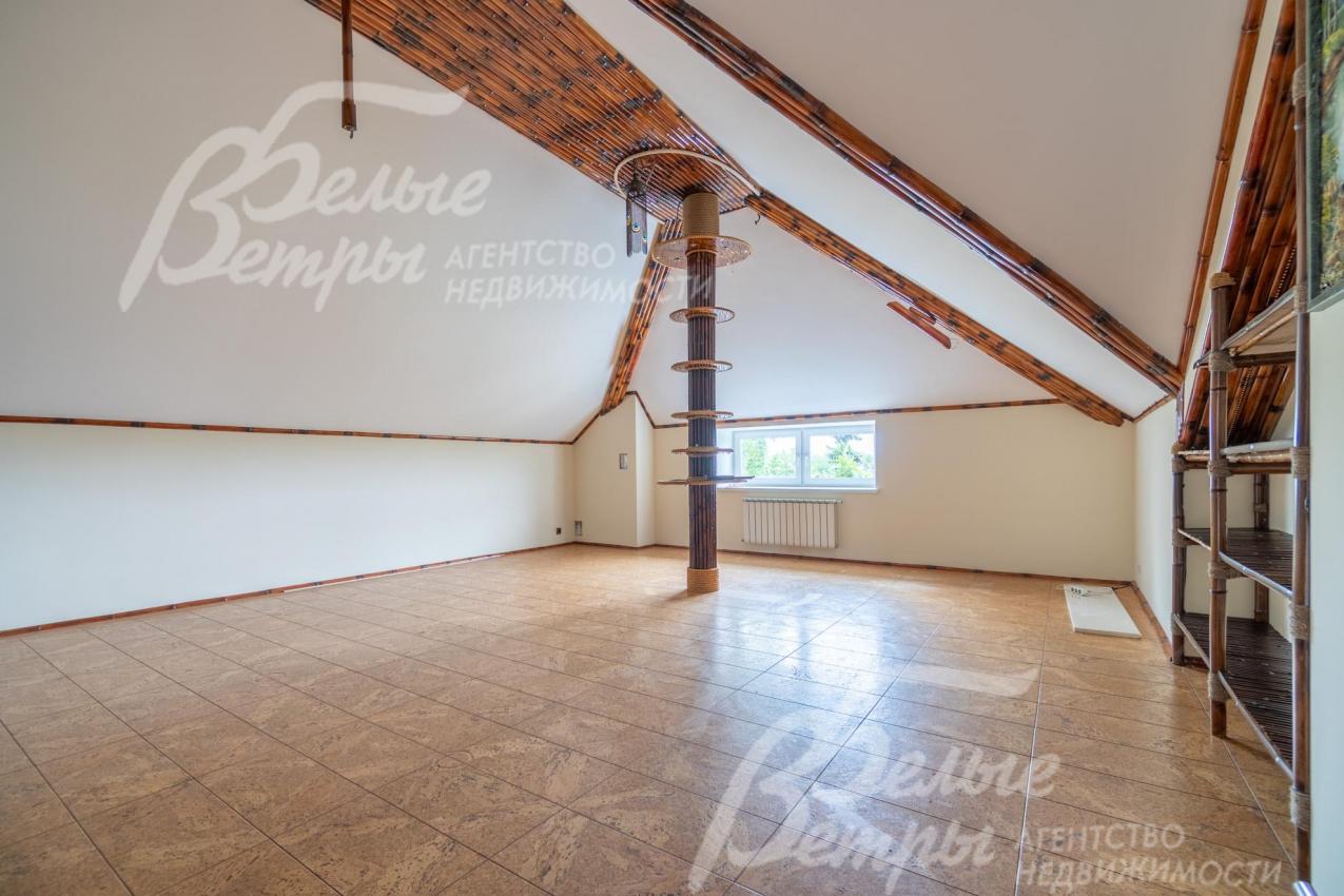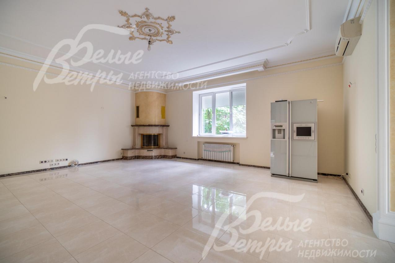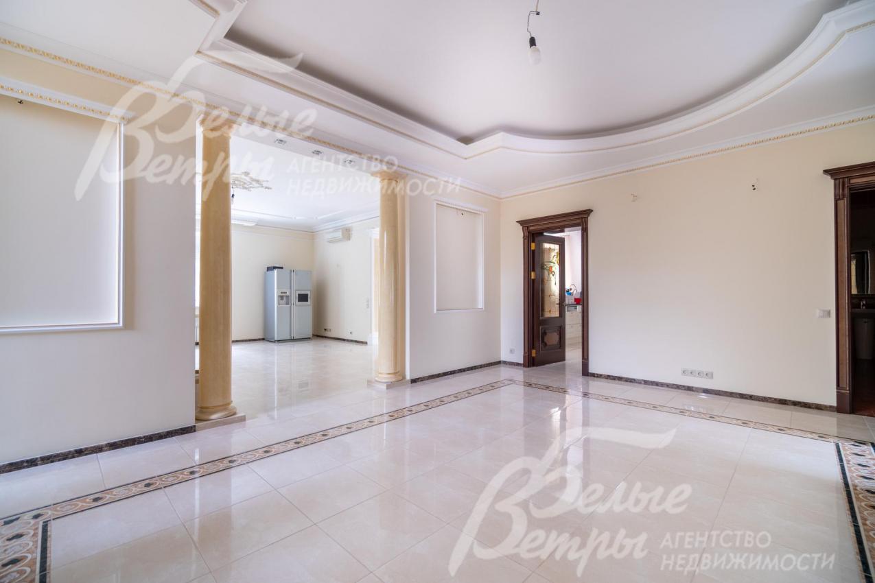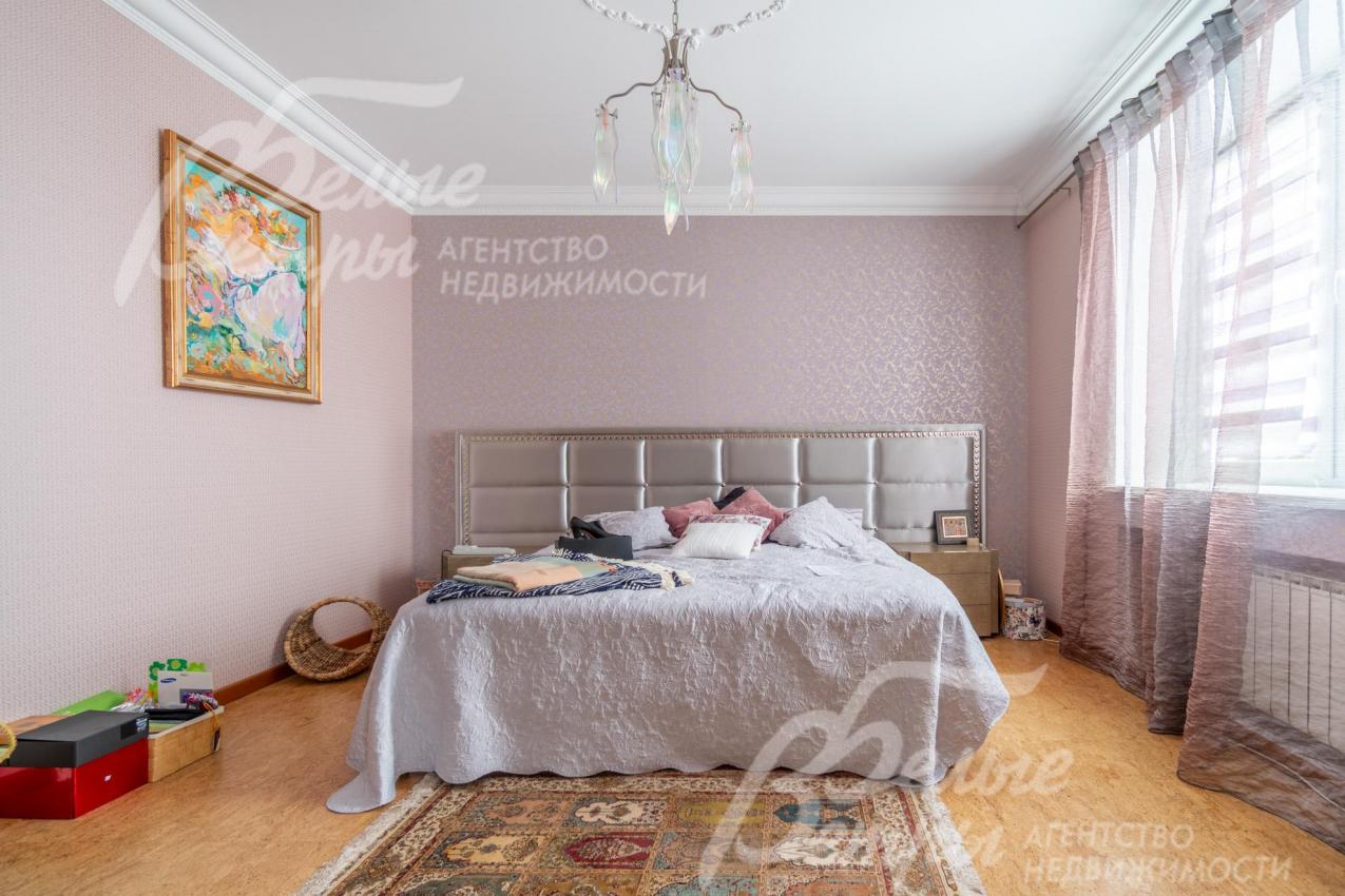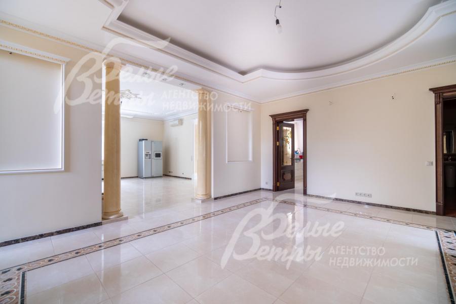 Описание внутренней отделки: выполнена отделка в пастельной гамме из дорогостоящих материалов высокого качества. Стены покрашены в светло-бежевые тона, в коридорах, на лестничных пролётах – панно в классическом стиле и элементы росписи, в спальнях поклеены обои, в санузлах выложена плита, в спортивном зале – крашеные стены, одна стена – зеркальная. На полу 1-го и цокольного этажей – плитка и керамогранит, в холлах 2-го и мансардного этажей – пробка, в спальнях – ламинат, в спортивном зале – ковролин. Потолки из гипсокартона. Установлены двери из массива дерева и подоконники ПВХ. На 2-й и мансардный этажи ведёт бетонная лестница со ступенями из натурального мрамора бело-серого оттенка. Гостиную украшает угловой камин