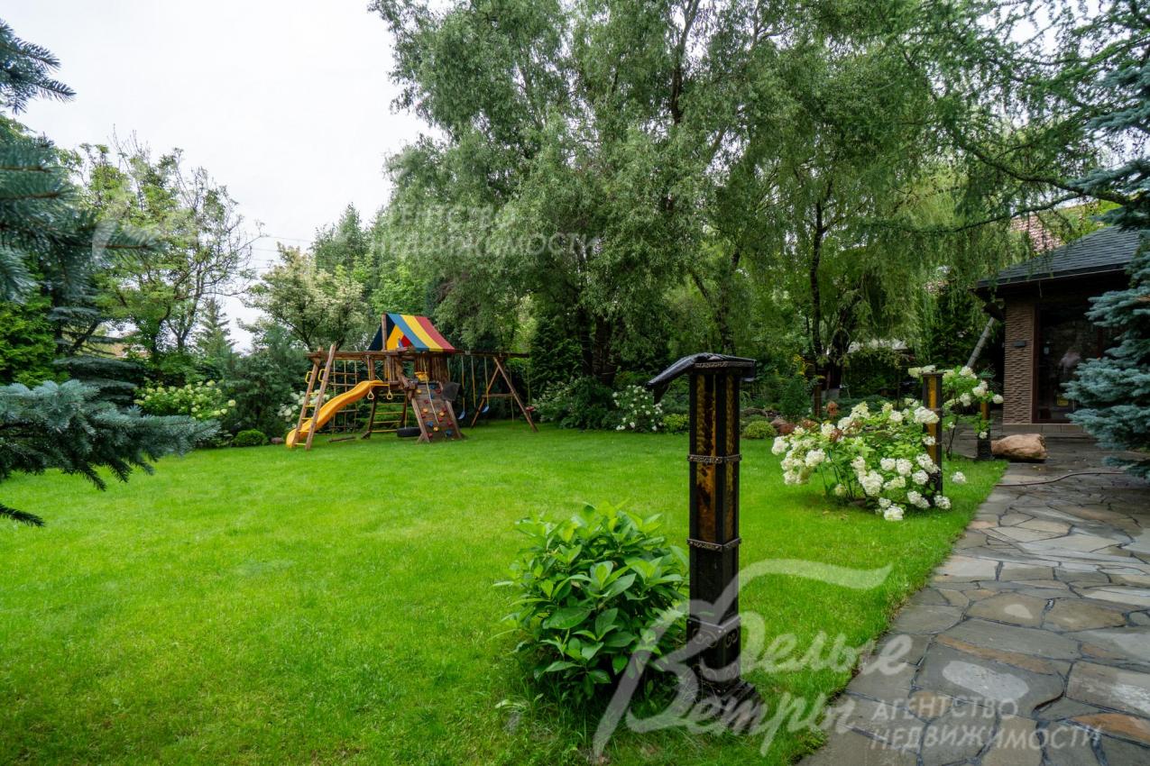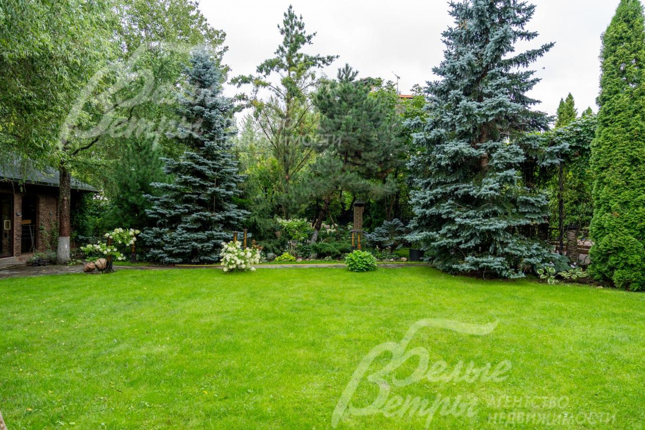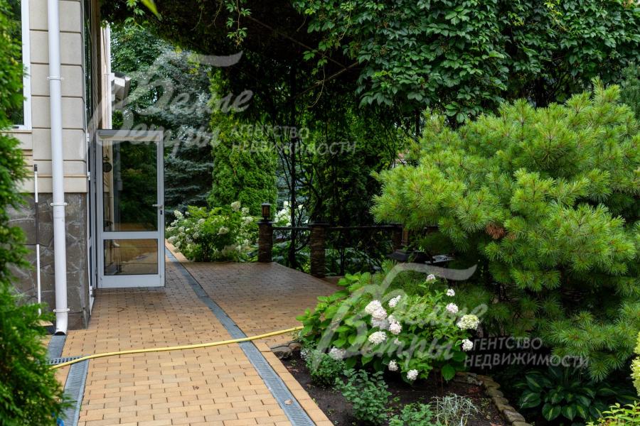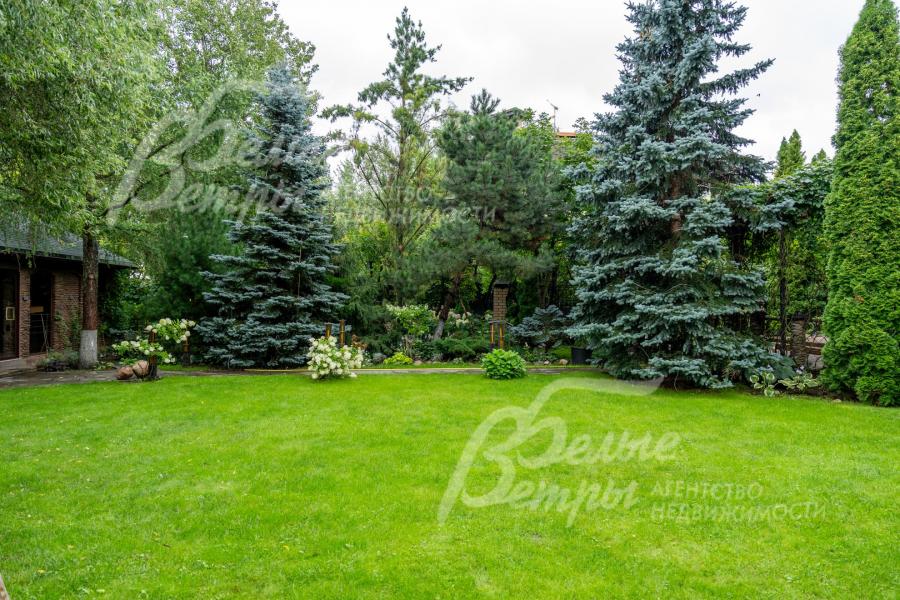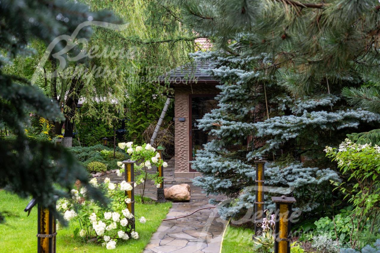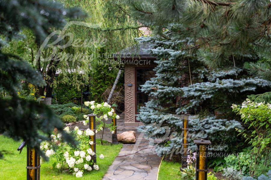 Благоустройство участка: на участке создан эффектный дорогостоящий парково-лесной ландшафт: есть пруд, прогулочные зоны, садовая зона с грядками и теплицей, детский игровой комплекс. Высажены лесные деревья (ели и сосны), плодовые деревья (яблони, груши и другие), туи, декоративные кустарники и розы, газон. Дорожки выложены диким камнем и плиткой, выполнено освещение. Над террасой – зелёный купол. По периметру участка проходит дренажная система