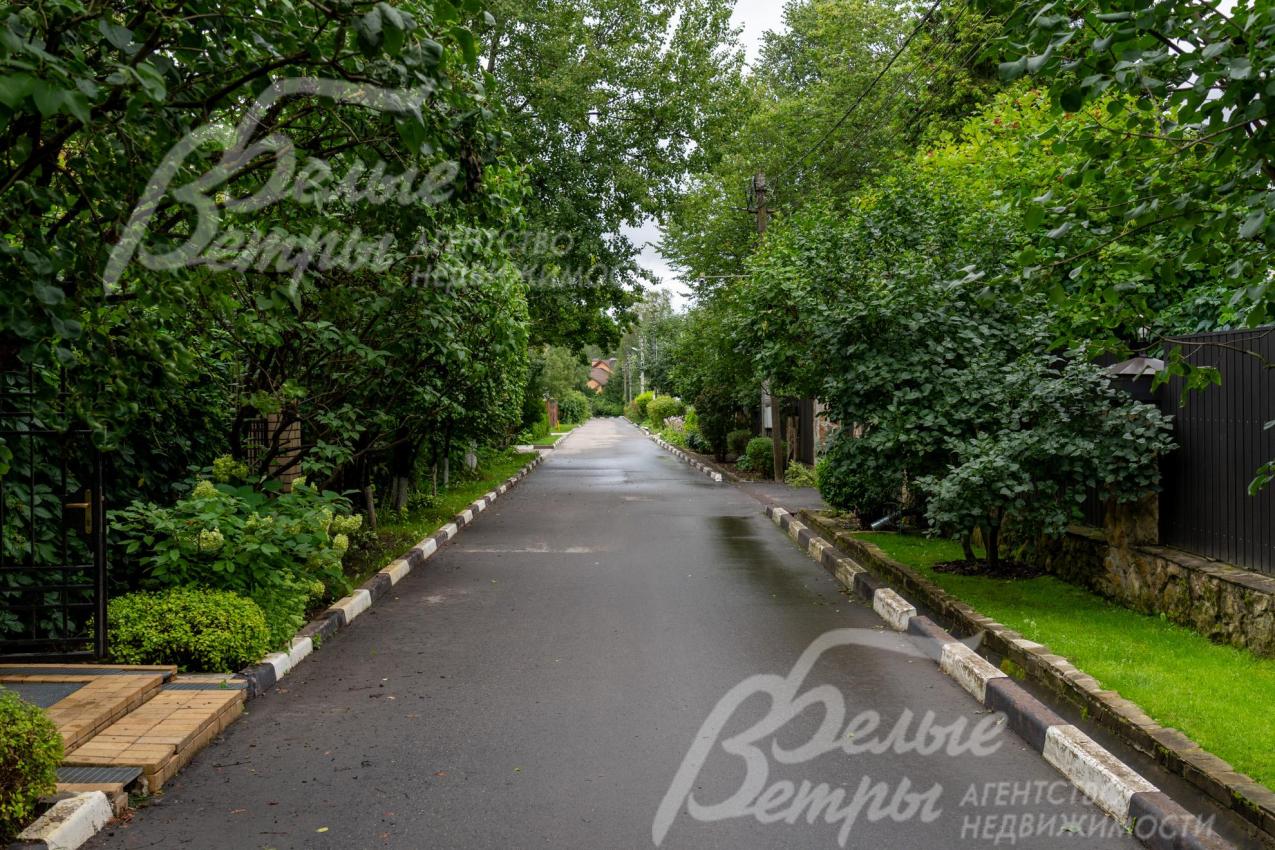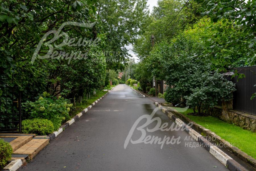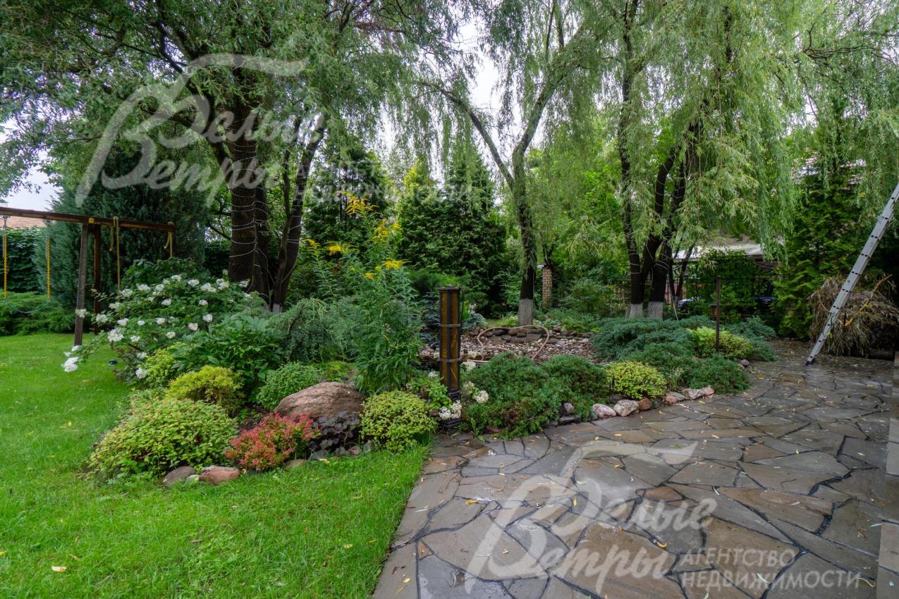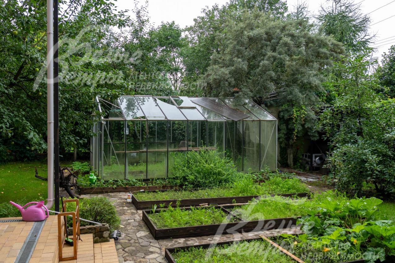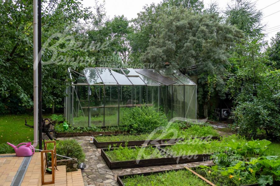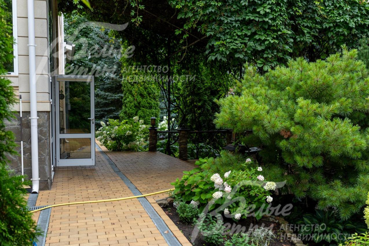 Благоустройство участка: на участке создан эффектный дорогостоящий парково-лесной ландшафт: есть пруд, прогулочные зоны, садовая зона с грядками и теплицей, детский игровой комплекс. Высажены лесные деревья (ели и сосны), плодовые деревья (яблони, груши и другие), туи, декоративные кустарники и розы, газон. Дорожки выложены диким камнем и плиткой, выполнено освещение. Над террасой – зелёный купол. По периметру участка проходит дренажная система