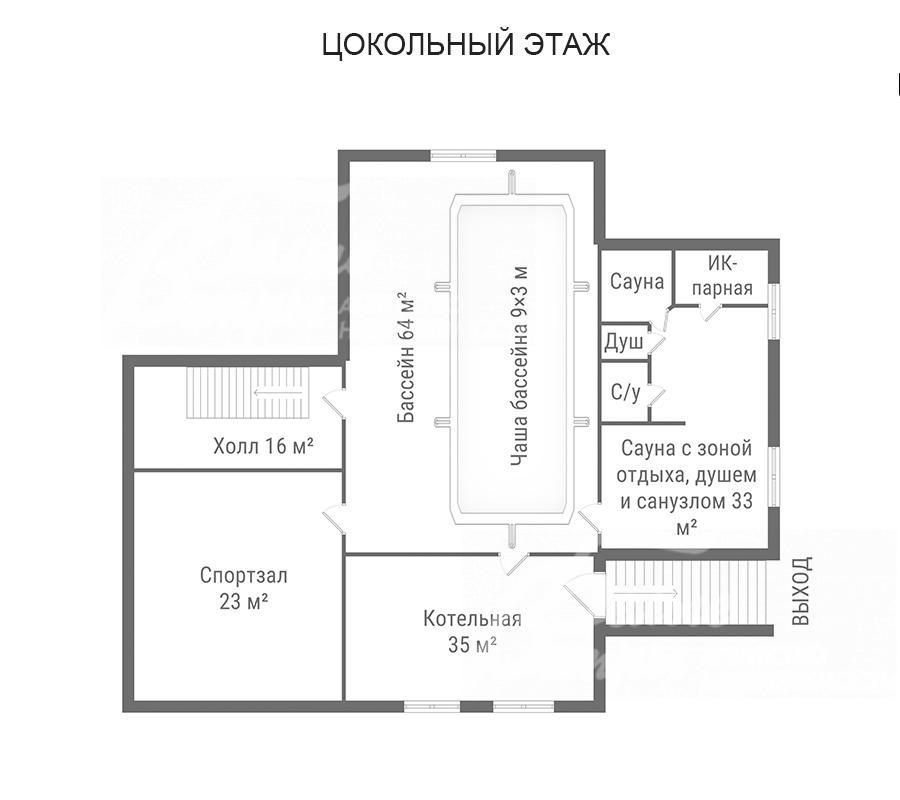 Цоколь: холл 16 кв.м, бассейн 64 кв.м, котельная 23 кв.м, сауна с зоной отдыха, душем и санузлом 33 кв.м, спортивный зал 35 кв.м