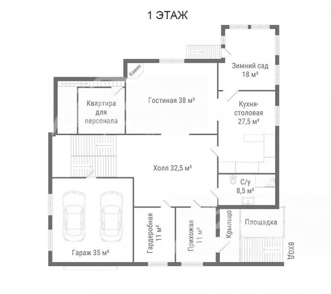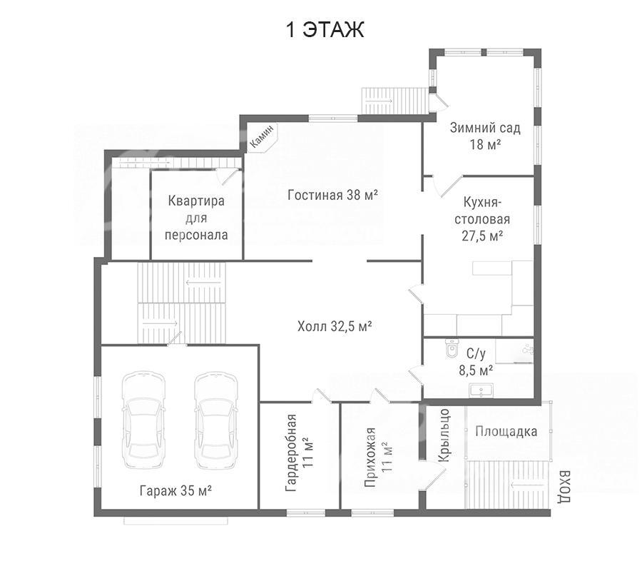 1-ый этаж: крыльцо с террасой (площадкой), прихожая 11 кв.м, холл 32,5 кв.м, гостиная с камином 38 кв.м, кухня-столовая 27,5 кв.м, зимний сад 18 кв.м, гардеробная 11 кв.м, санузел 8,5 кв.м, гараж 35 кв.м, квартира для персонала