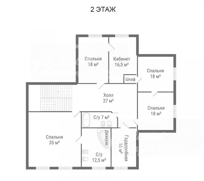 2-ой этаж: холл 28 кв.м, спальня 35 кв.м с санузлом 12,5 кв.м, спальня 18 кв.м, спальня 18 кв.м, спальня 18 кв.м, кабинет 16,5 кв.м, санузел 7 кв.м, гардеробная 10 кв.м