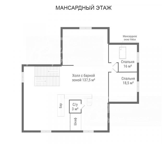 3-ий этаж: мансардный этаж: холл с барной зоной 137,5 кв.м, спальня 16 кв.м, спальня 18,5 кв.м, санузел 3 кв.м