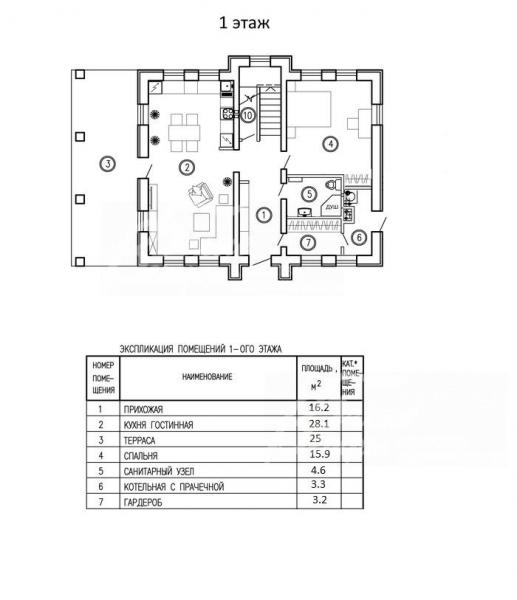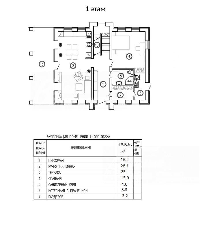 1-ый этаж: прихожая 16 кв.м с гардеробной 3.2 кв.м, кухня-гостиная 28 кв.м с выходом на террасу 25 кв.м, спальня 16 кв.м, санузел 4.6 кв.м (душевая), котельная 3.3 кв.м с отдельным входом