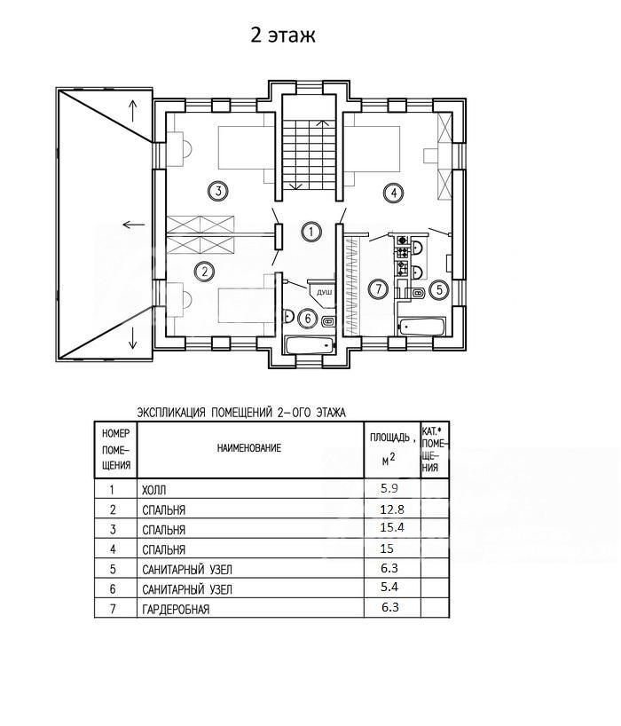 2-ой этаж: холл 6 кв.м, главная спальня 15 кв.м с санузлом 6.3 кв.м (ванная) и с гардеробной 6.3 кв.м, спальня 15.4 кв.м, спальня 13 кв.м, общий санузел 5.4 кв.м (душевая, ванная)