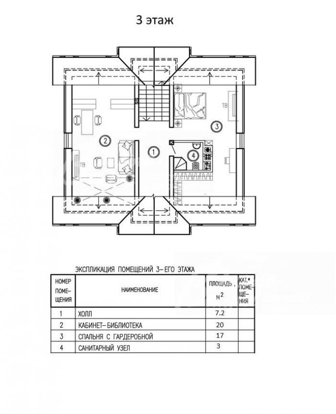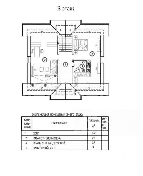 3-ий этаж: холл 7 кв.м, кабинет-библиотека 20 кв.м, спальня с гардеробной 17 кв.м, санузел 3 кв.м (душевая)