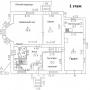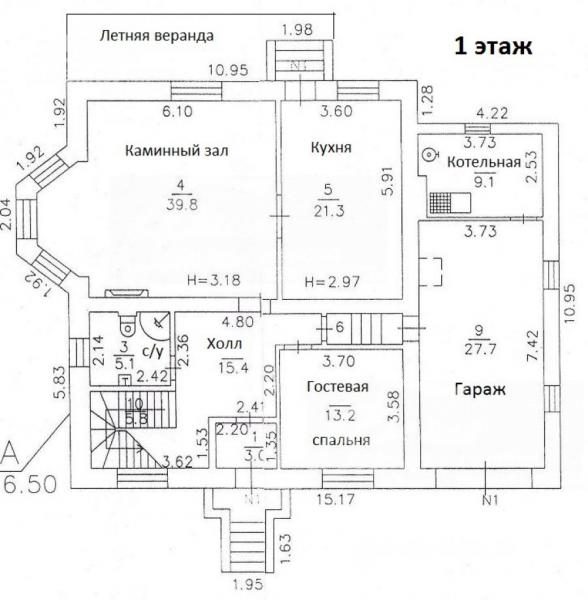 1-ый этаж: тамбур, холл 15 кв.м, каминный зал 40 кв.м с выходом на летнюю веранду 16 кв.м, кухня 21 кв.м, гостевая спальня 13 кв.м, с/узел 5 кв.м; котельная 9 кв.м, гараж 28 кв.м