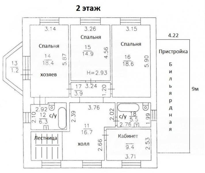 2-ой этаж: холл 17 кв.м, спальня хозяев 18.4 кв.м с с/узлом 6.3 кв.м и балконом, спальня 18.6 кв.м, спальня 15 кв.м, кабинет 9.4 кв.м, с/узел 5.5 кв.м, бильярдная 37 кв.м