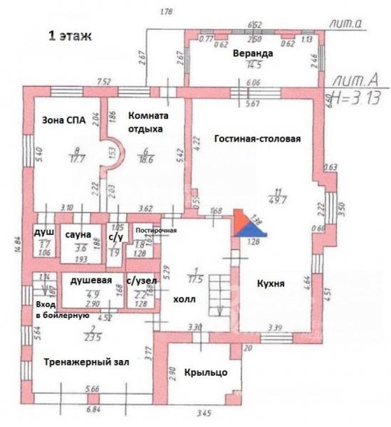 1-ый этаж: крыльцо, прихожая-холл 18 кв.м, кухня-гостиная с камином 50 кв.м и выходом на веранду 15 кв.м, зона СПА с бассейном 18 кв.м, с сауной 4 кв.м и душевой, комната отдыха 19 кв.м, с/узел, тренажерный зал 24 кв.м с душевой 5 кв.м, гостевой с/узел, постирочная, бойлерная