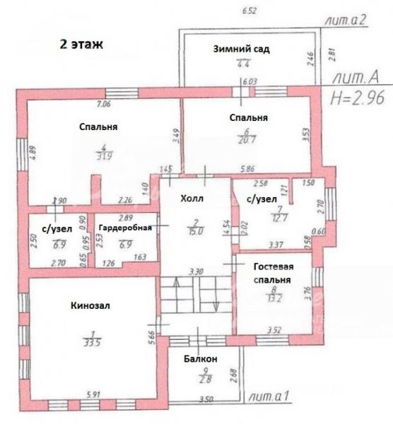 2-ой этаж: холл 15 кв.м, кинозал 34 кв.м, балкон, гостевая спальня 13 кв.м, гардеробная 7 кв.м, с/узел 13 кв.м, хозяйская спальня 21 кв.м с выходом в зимний сад 4 кв.м, спальня 32 кв.м с с/узлом 7 кв.м