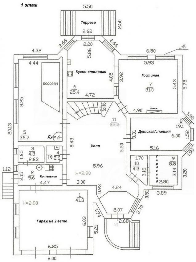 1-ый этаж: крыльцо, прихожая и холл 55,5 кв.м, гардеробная 9 кв.м, спальня 19 кв.м, гостиная с камином 31 кв.м, кухня-столовая 25 кв.м с выходом на открытую террасу, зона бассейна 36,5 кв.м (чаша бассейна 5,5×1,8 м) с душевой кабиной, парной и фитобочкой, санузел 3 кв.м, котельная 9 кв.м, постирочная 4 кв.м; гараж на 2 автомобиля 41 кв.м