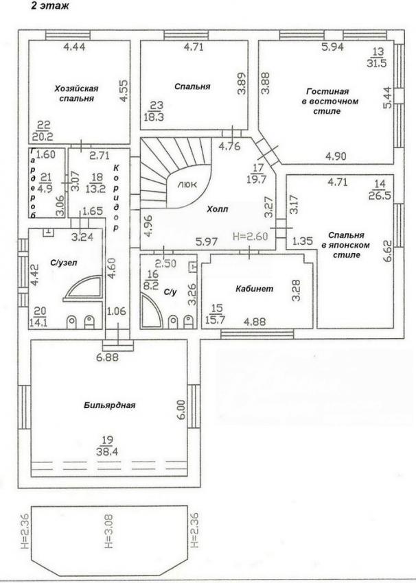 2-ой этаж: холл 20 кв.м, мастер-спальня 20 кв.м с коридором 13 кв.м, гардеробной 5 кв.м, санузлом с ванной (джакузи) 14 кв.м, кабинет 16 кв.м, бильярдная 38 кв.м, детская игровая 32 кв.м, спальня 18 кв.м, спальня 26 кв.м, санузел 8 кв.м с ванной