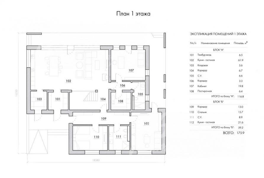 1-ый этаж: тамбур 6.5 кв.м, кухня-гостиная 62 кв.м с выходом на террасу, кладовая 5.6 кв.м, кабинет 20 кв.м с выходом на террасу, санузел 6.6 кв.м, постирочная 6.4 кв.м, коридор 13 кв.м, мастер-блок: спальня 16 кв.м, санузел 9 кв.м, вторая кухня-гостиная 21.6 кв.м с выходом на террасу