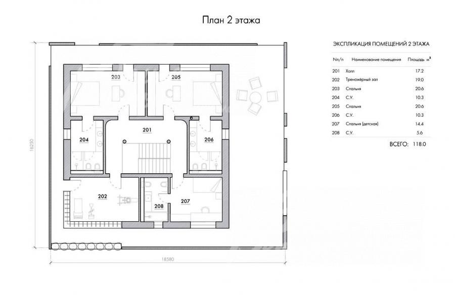 2-ой этаж: холл 17 кв.м, две спальни по 20.6 кв.м со своими санузлами 10 кв.м, детская спальня 14.5 кв.м с санузлом 5.6 кв.м, тренажерный зал 19 кв.м с выходом на открытую террасу по периметру дома с великолепными видами