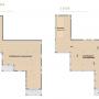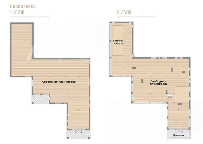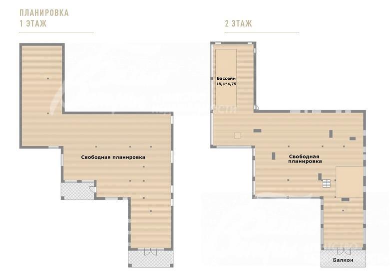 1-ый этаж: Свободная планировка: можно спроектировать 4-5 спален, изолированные или объединенные кухню, гостиную и столовую, кабинет. Предусмотрен бассейн 18.4х4.75 м. Благодаря рельефу есть выход на участок с обоих этажей.