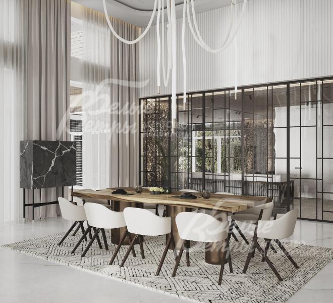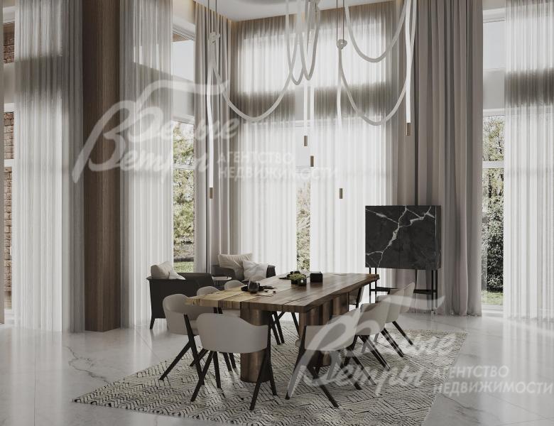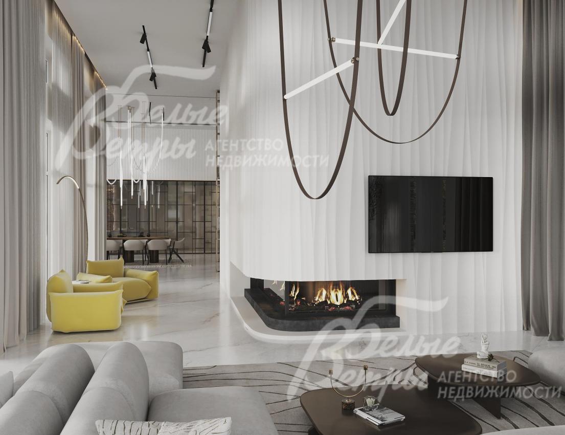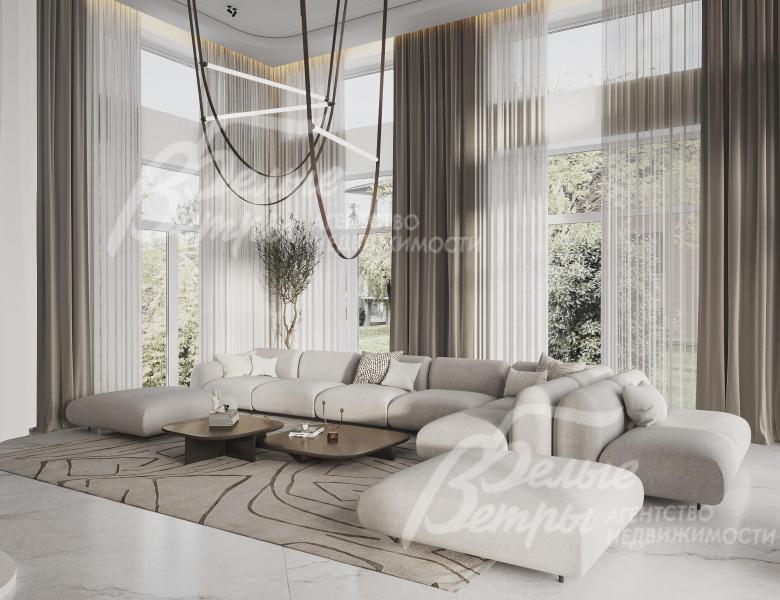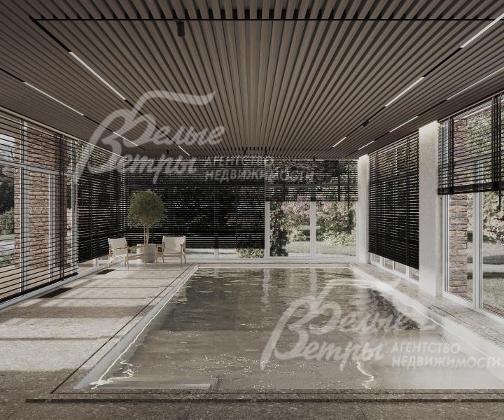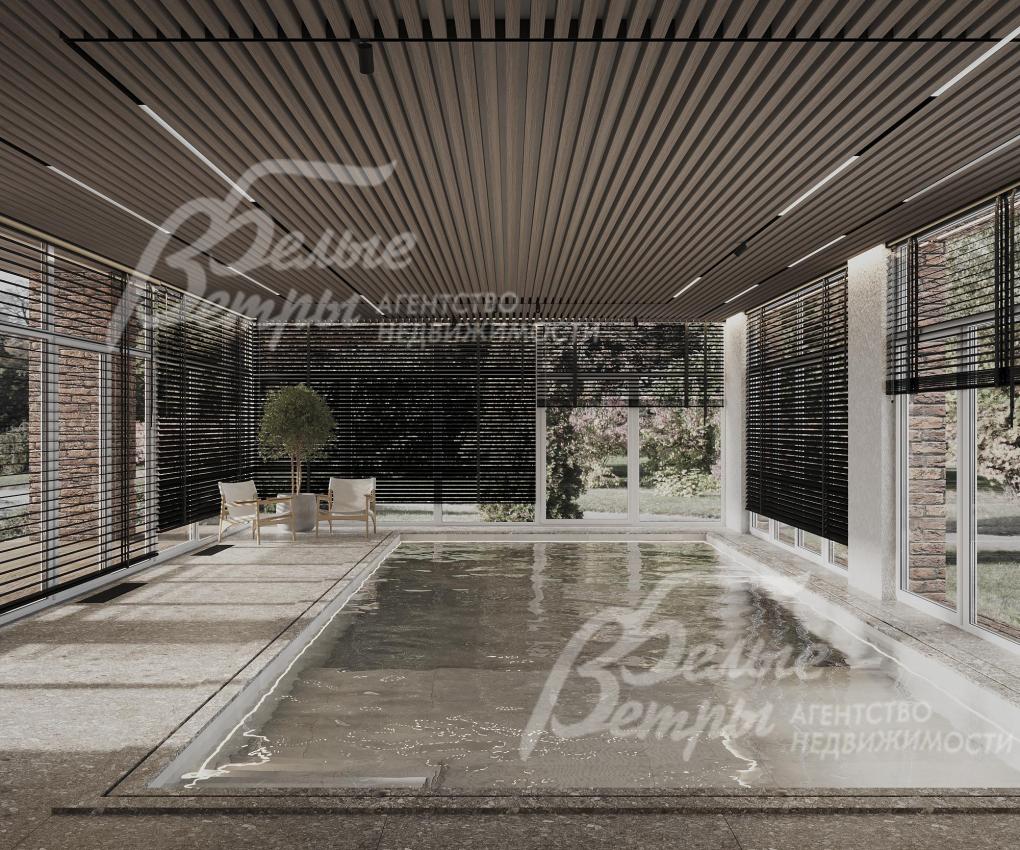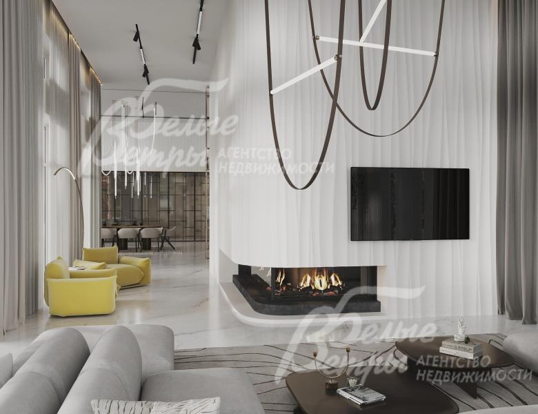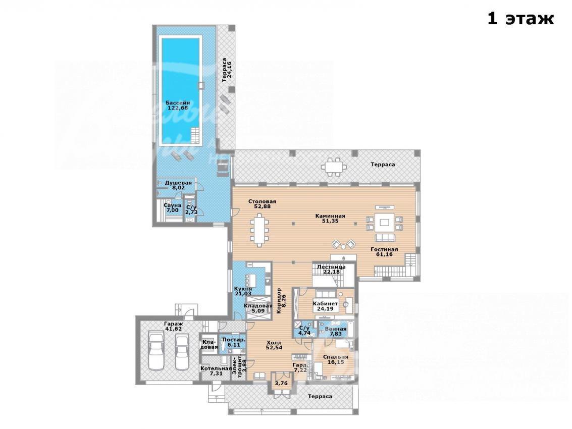 1-ый этаж: Свободная планировка: предполагается: крытая терраса 44 кв.м, тамбур, холл 29 кв.м, кухня 22 кв.м с выходом на открытую террасу, гостиная-столовая 59 кв.м с выходом на крытую веранду 44 кв.м, гостиная с камином 35 кв.м, кабинет 24 кв.м с санузлом 7 кв.м, спортзал 19 кв.м, санузел 4 кв.м, помещение бассейна 123 кв.м с сауной 7 кв.м, душевой и санузлом, гараж 43 кв.м, электрощитовая, постирочная, котельная