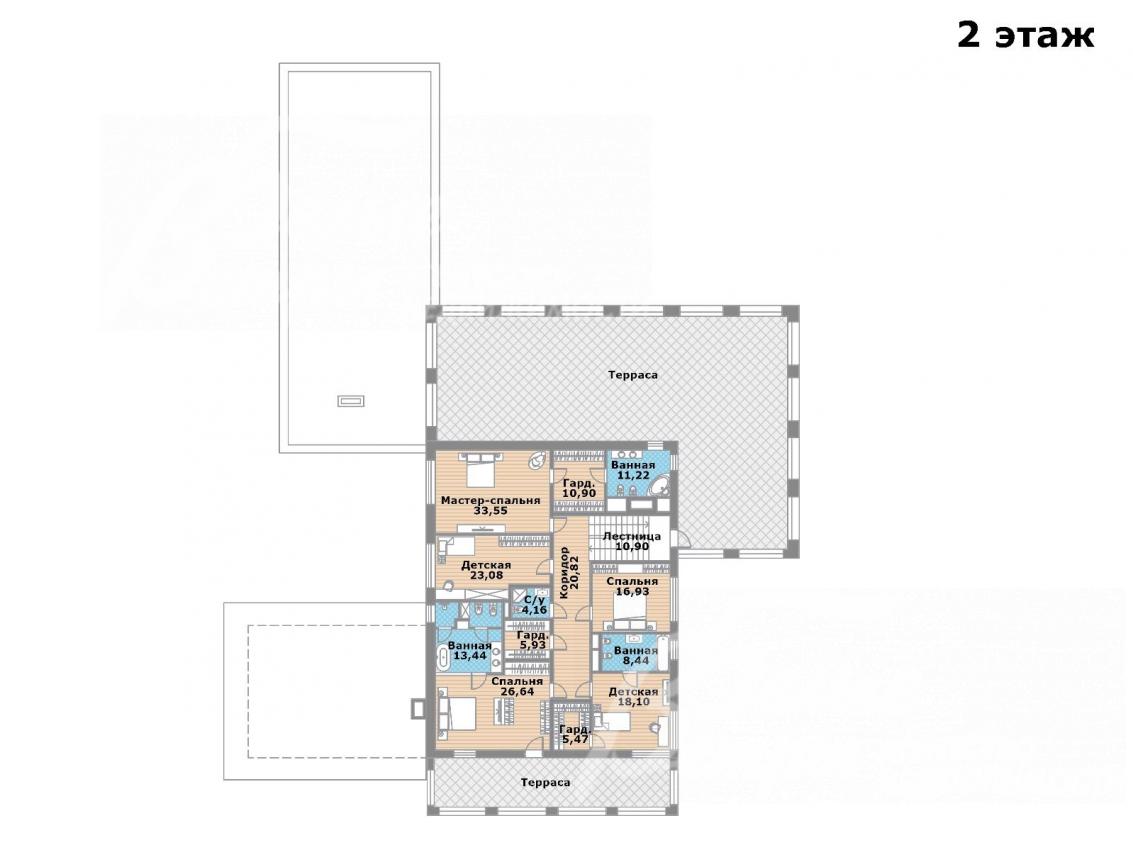 2-ой этаж: Свободная планировка: предполагается: холл 15 кв.м, мастер спальня 29 кв.м с санузлом 14 кв.м с выходом на балкон 44 кв.м, детская спальня 19 кв.м с санузлом 8 кв.м и гардеробной 4 кв.м, детская комната 29 кв.м, гостевая спальня 16 кв.м, санузел 4 кв.м, гардеробная 6 кв.м