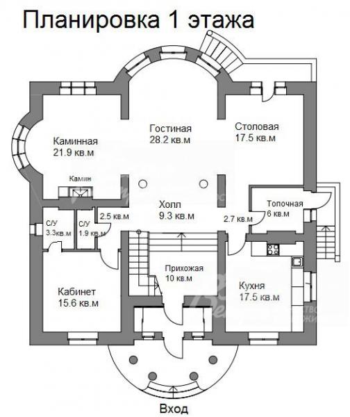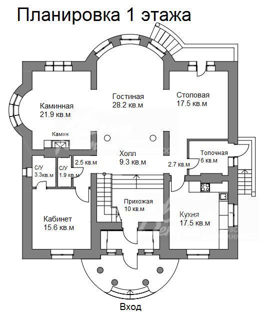 1-ый этаж: тамбур 6 кв.м, прихожая 10 кв.м, холл 9 кв.м, гостиная 28 кв.м, кухня 18 кв.м, столовая 17 кв.м, каминный зал 22 кв. м, кабинет/спальня 16 кв.м, санузел 5 кв.м, топочная 6 кв.м