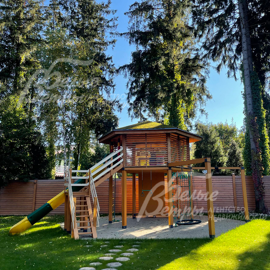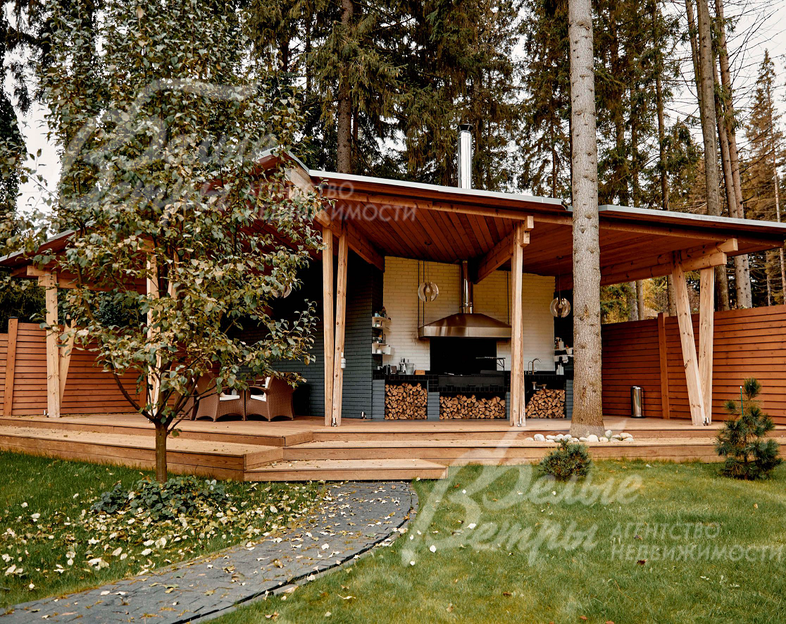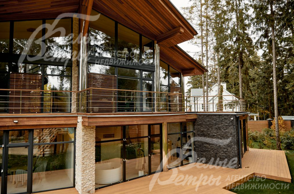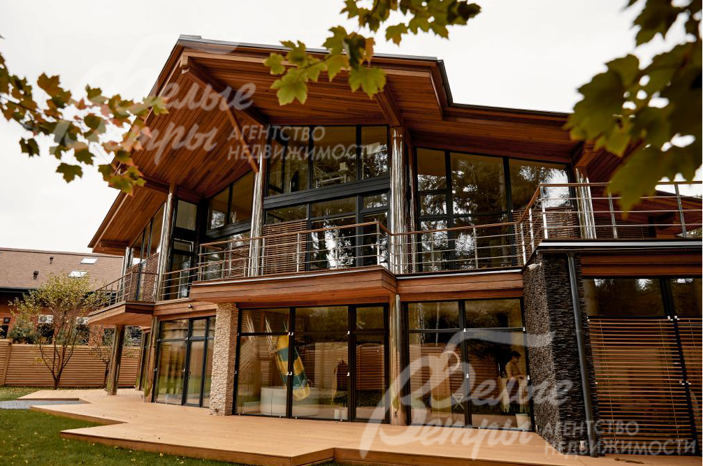 Дом облицован лиственницей, искусственным камнем под сланец и элементами из нержавейки