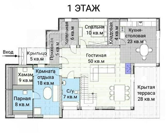 1-ый этаж: крыльцо 5 кв.м, просторная прихожая 5 кв.м, гостиная со вторым светом 50 кв.м, спальня-1 10 кв.м с большими обзорными окнами, кухня-столовая 23 кв.м с кладовой 4 кв.м (можно переделать под холодильную комнату) и выходом на крытую террасу 28 кв.м, санузел 7 кв.м с ванной, комната отдыха 18 кв.м с душевой, парная 8 кв.м, хамам 9 кв.м, котельная 6 кв.м.