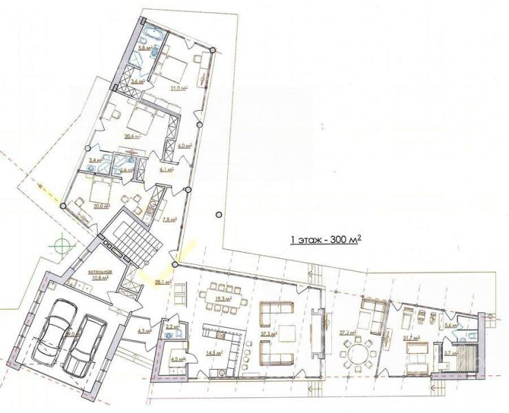 1-ый этаж: Тамбур 4 кв.м, холл 28 кв.м, с/узел, кухня 14.5 кв.м, столовая 19 кв.м, гостиная 37 кв.м, СПА-зона 27 кв.м с сауной 6 кв.м (вход через улицу), коридор 8 кв.м, спальня 20 кв.м с с/узлом, спальня 20.6 кв.м с с/узлом 3.4 кв.м, спальня 21 кв.м с с/узлом 6 кв.м с гардеробной 4 кв.м, постирочная 4.5 кв.м, котельная 11 кв.м, гараж 39 кв.м, открытая терраса около 70 кв.м, закрытая терраса с мангалом 27 кв.м. Из каждого помещения есть выход на открытую террасу.