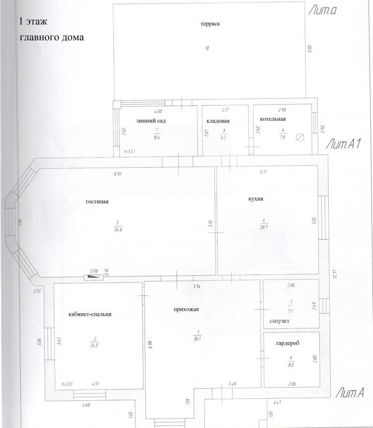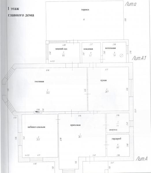 1-ый этаж: Прихожая- холл 36 кв.м с гардеробной 8 кв.м, кухня-столовая 29 кв.м, гостиная 55 кв.м, зимний сад 10 кв.м, спальня-кабинет 24.5 кв.м, с/узел 7 кв.м, прачечная, котельная, терраса 49 кв.м с рольставнями и барбекю