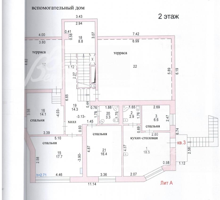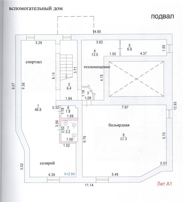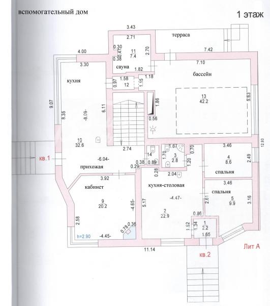 - Вспомогательный дом 389 кв.м (Цоколь: спортзал с солярием 47 кв.м с душевыми и с с/узлом, бильярдная со столом 9-футового русского бильярда, с баром 52 кв.м; 1 эт.: кухня 33 кв.м, кабинет 20 кв.м, с/узел, зона бассейна 42 кв.м с чашей переливного бассейна 5х3.6м, с подогреваемым каменным лежаком, парная с каменной печкой на дровах; Кв.№ 1 (для персонала/гостей) с отдельным входом: кухня-гостиная 23 кв.м, две спальни 10 кв.м и 9 кв.м, с/узел; 2 эт.: холл 14 кв.м с выходом на террасу 41.5 кв.м, спальня 14 кв.м с выходом на террасу 18.5 кв.м, две спальни 18 кв.м и 16 кв.м, с/у; Кв.№ 2 (для персонала/гостей) с отдельным входом с улицы: кухня-столовая 18.5 кв.м, спальня 7 кв.м, с/узел)
