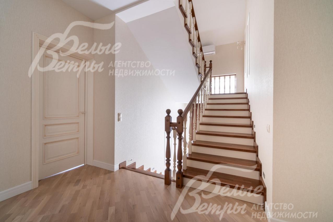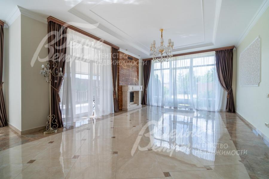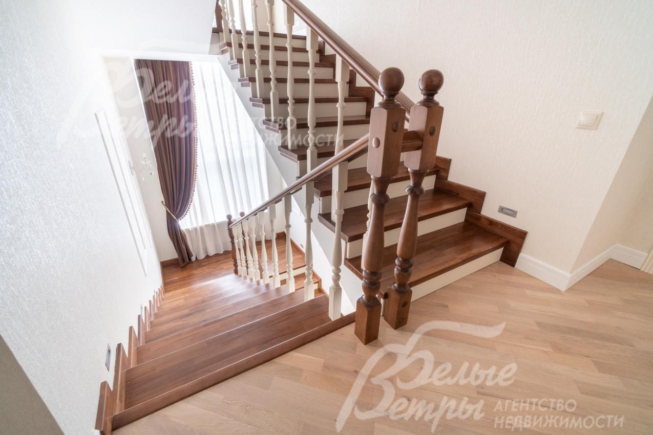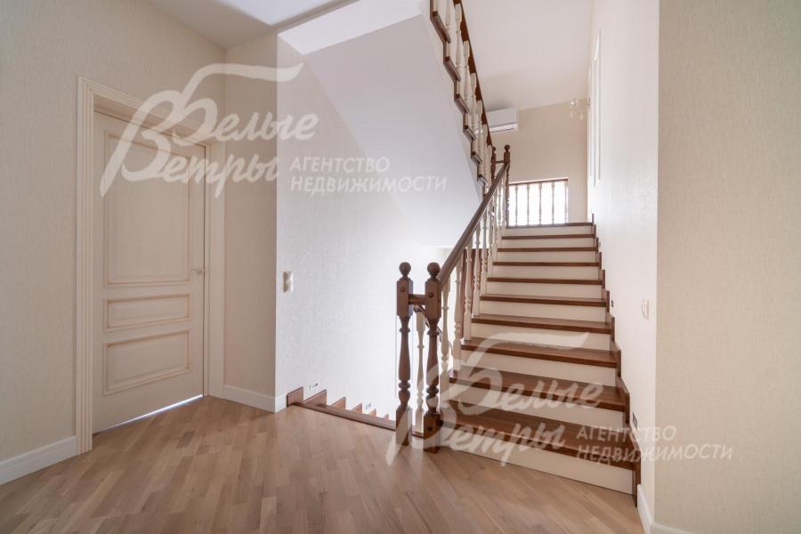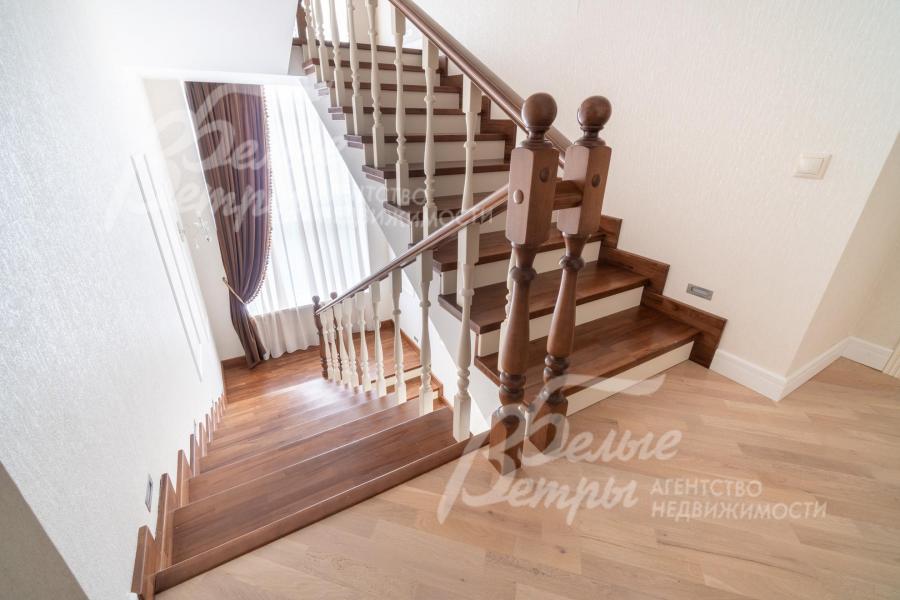 Описание внутренней отделки: в доме выполнена отделка под ключ, интерьер оформлен в стиле современной классики. Стены отделаны с использованием краски и обоев. На полу - плитка с подогревом (часть 1-го этажа и санузлы 2-го и мансардного этажей) и паркетная доска. Потолки гипсокартонные. Установлены стальные напольные радиаторы (KERMI), межкомнатные двери из массива ясеня, пластиковые подоконники. На второй этаж ведёт лестница на железобетонном каркасе с ограждением и ступенями из натурального дуба. Гостиную украшает камин, отделанный бежевым мрамором