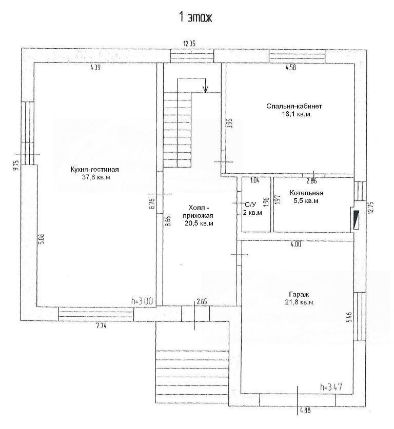 1-ый этаж: крыльцо, холл-прихожая 20.5 кв.м, кухня-столовая/гостиная 38 кв.м, спальня/кабинет 18 кв.м, с/узел 2 кв.м, котельная 5.5 кв.м, гараж 22 кв.м