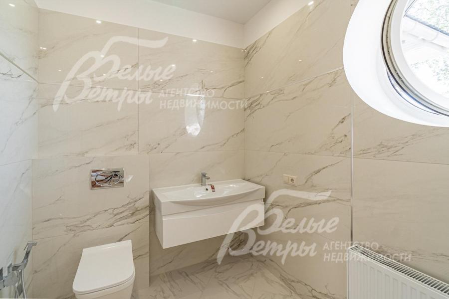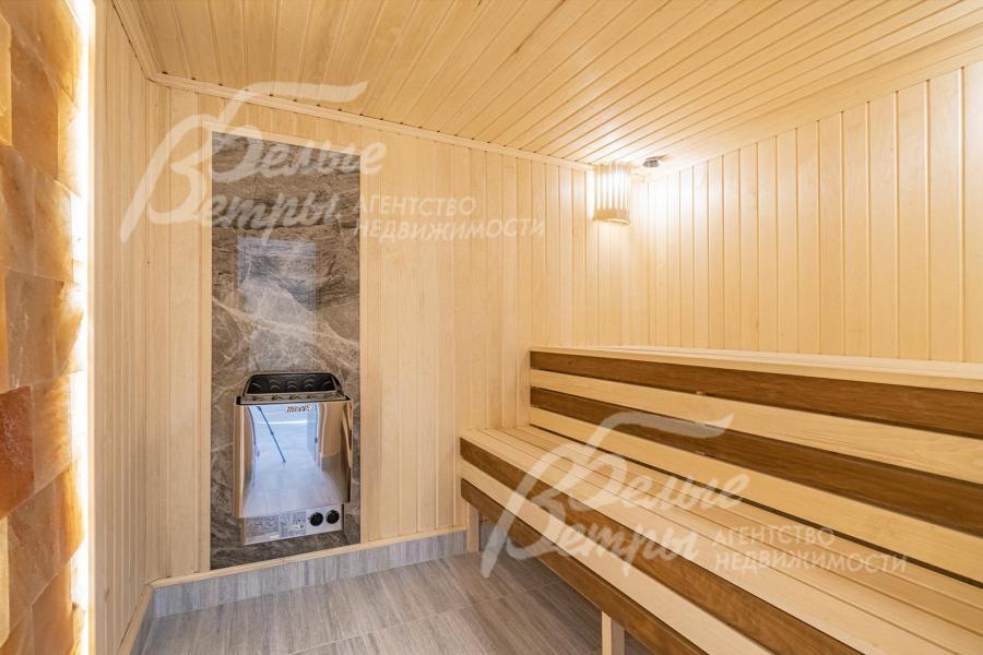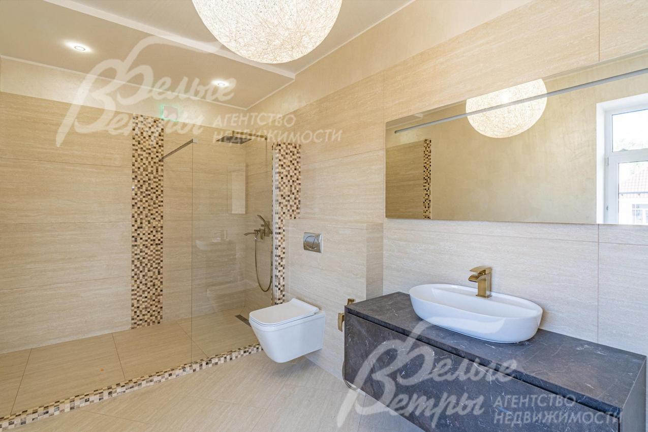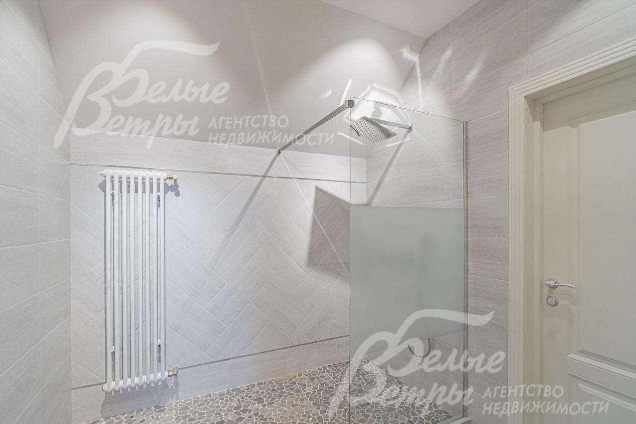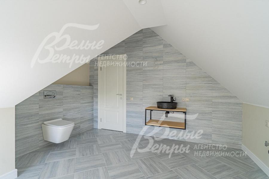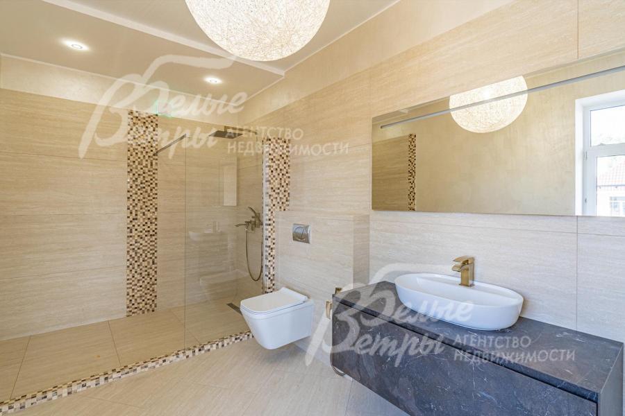 Описание внутренней отделки: отделка выполнена в современном стиле, преимущественно в светлых тонах, с использованием дорогих материалов. На стенах декоративная штукатурка (Венецианка), обои с текстильными вставками, в санузлах - керамогранит. В сауне - вставки из гималайской соли. В мастер-спальне на стене декоративное панно из зеркал. Полы: 1 этаж - керамогранит с водяным подогревом, 2 этаж - паркетная доска, мансарда - ламинат высокого класса. Лестница ж/б монолитная стандартной ширины, ступени мраморные CREMA MARFIL (месторождение камня - Италия) с подсветкой, ограждение и поручни - закалённое стекло. Потолки подвесные ГКЛ фигурные с различной подсветкой. В 2-х спальнях - натяжной потолок, в мастер-спальне - ГКЛ фигурный с различной подсветкой. Установлена вся сантехника GAPPO (немецкое качество). Все коммуникации разведены под ключ. Трубы REHAU, радиаторы стальные Kermi. Там, где окна от пола, установлены внутрипольные конвекторы. Э/э Legrand. Подоконники мраморные.