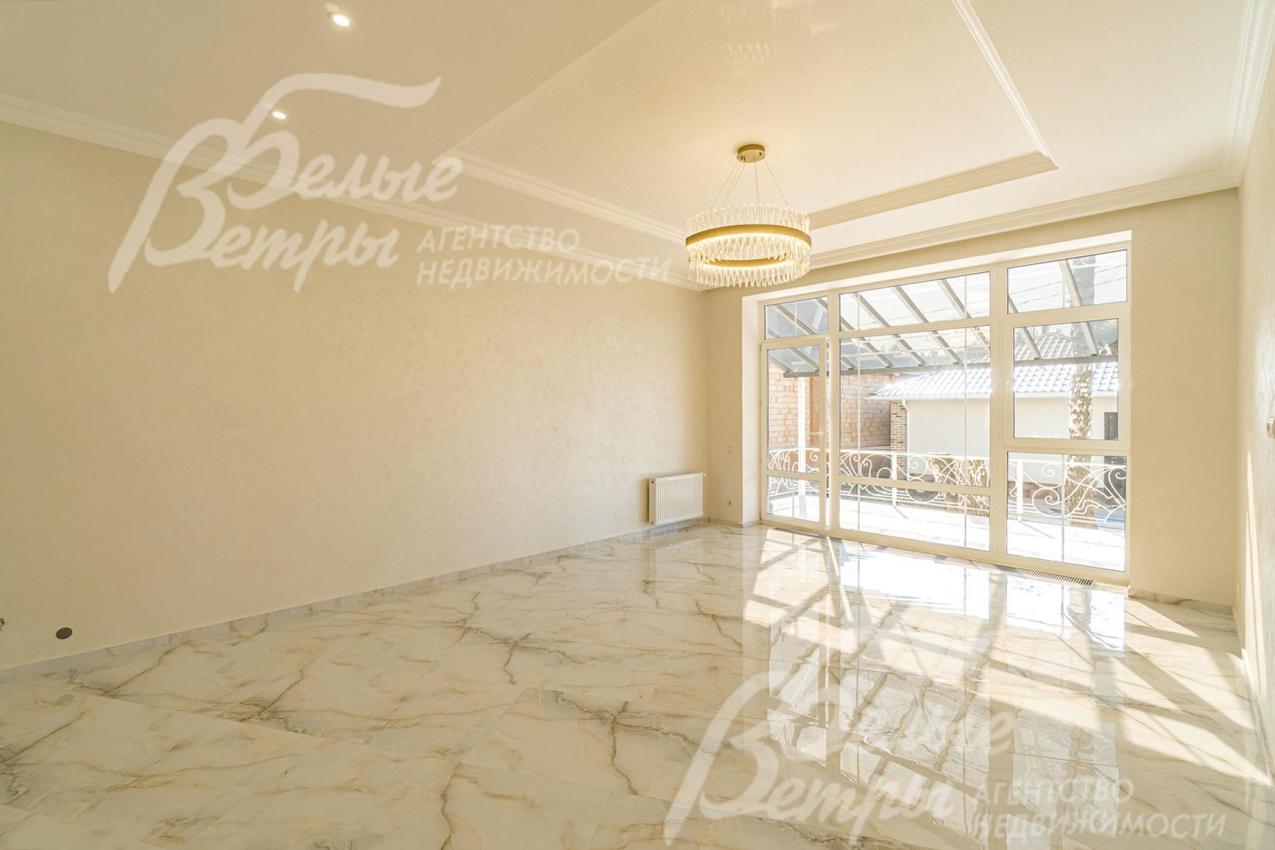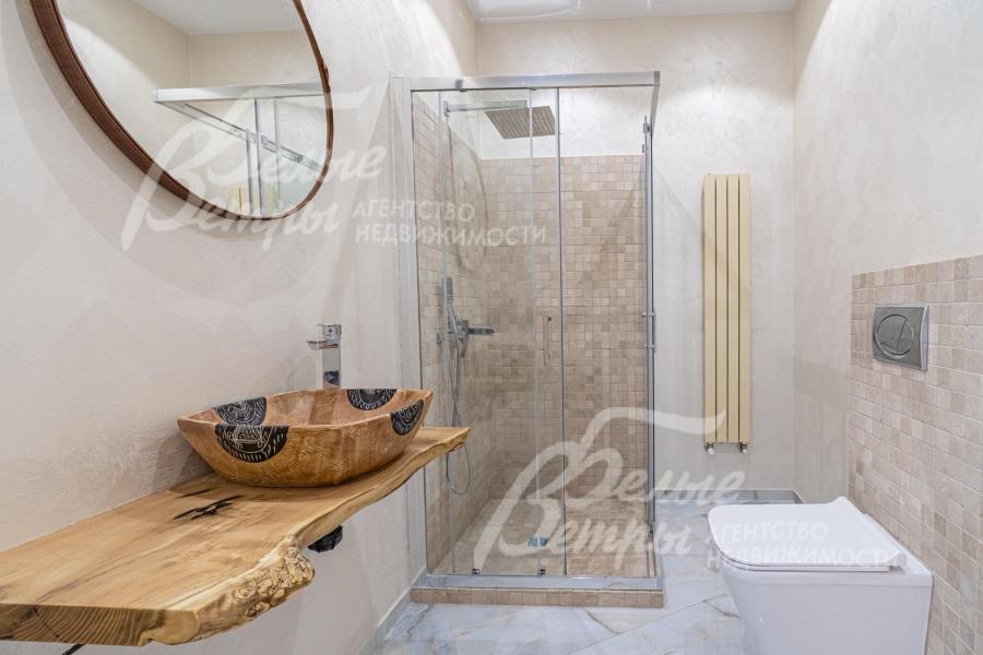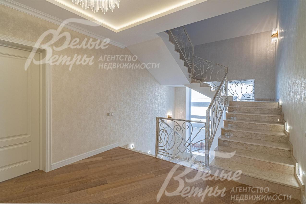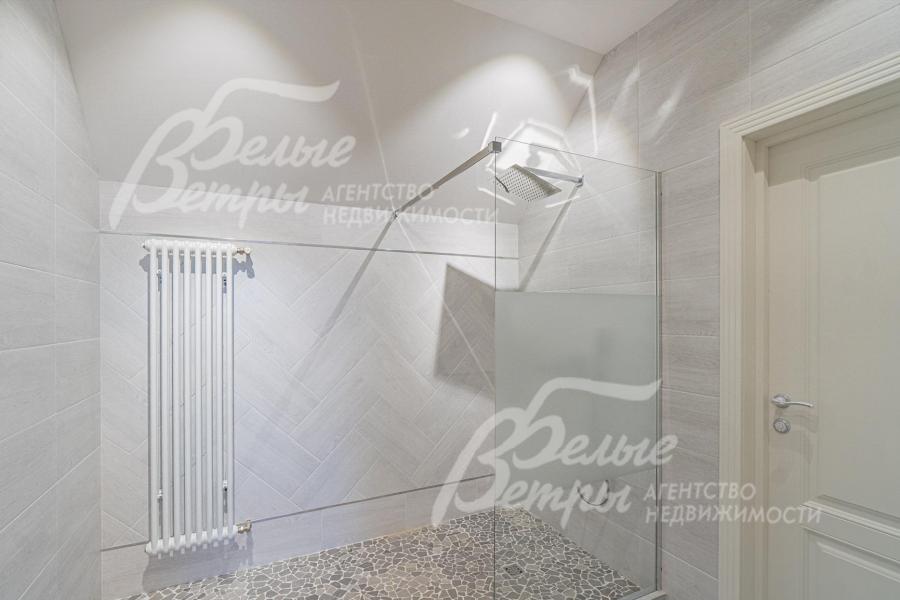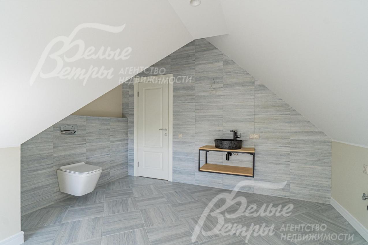 Описание внутренней отделки: отделка выполнена в современном стиле, преимущественно в светлых тонах, с использованием дорогих материалов. На стенах декоративная штукатурка (Венецианка), обои с текстильными вставками, в санузлах - керамогранит. В сауне - вставки из гималайской соли. В мастер-спальне на стене декоративное панно из зеркал. Полы: 1 этаж - керамогранит с водяным подогревом, 2 этаж - паркетная доска, мансарда - ламинат высокого класса. Лестница ж/б монолитная стандартной ширины, ступени мраморные CREMA MARFIL (месторождение камня - Италия) с подсветкой, ограждение и поручни - закалённое стекло. Потолки подвесные ГКЛ фигурные с различной подсветкой. В 2-х спальнях - натяжной потолок, в мастер-спальне - ГКЛ фигурный с различной подсветкой. Установлена вся сантехника GAPPO (немецкое качество). Все коммуникации разведены под ключ. Трубы REHAU, радиаторы стальные Kermi. Там, где окна от пола, установлены внутрипольные конвекторы. Э/э Legrand. Подоконники мраморные.
