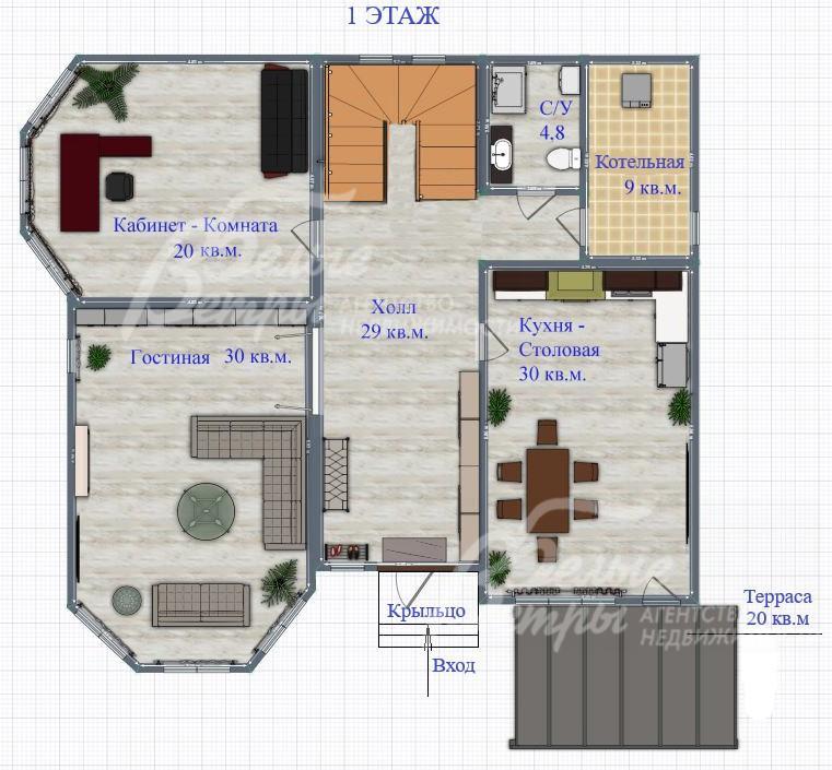 1-ый этаж: холл 29 кв.м, кухня-столовая 30 кв.м, гостиная 30 кв.м, терраса 20 кв.м, спальня-кабинет 20 кв.м, кладовка 4 кв.м, санузел 5 кв.м, котельная 9 кв.м.