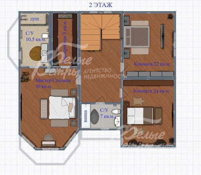 2-ой этаж: холл 8 кв.м, мастер-спальня 30 кв.м с гардеробной 9 кв.м и ванной комнатой 11 кв.м, спальня 22 кв.м, спальня 24 кв.м, санузел 7 кв.м.
