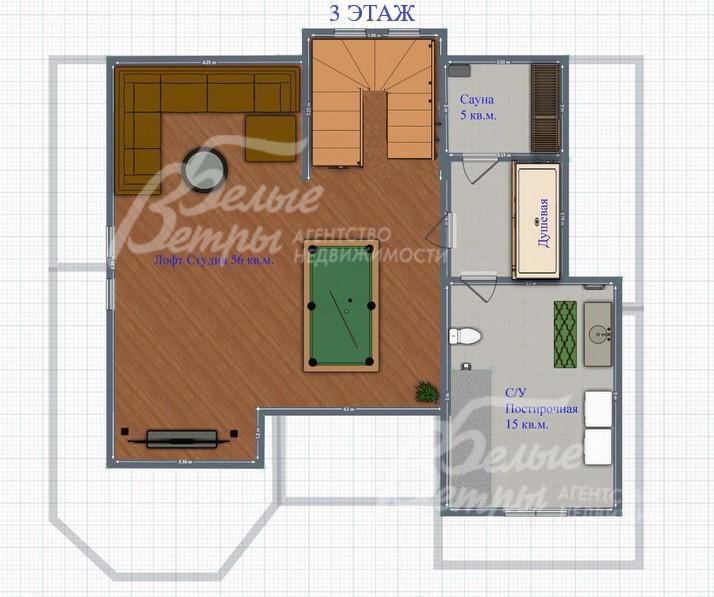 3-ий этаж: комната под бильярдную 56 кв.м, санузел-постирочная 15 кв.м, сауна 5 кв.м.