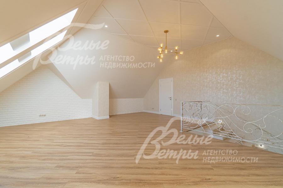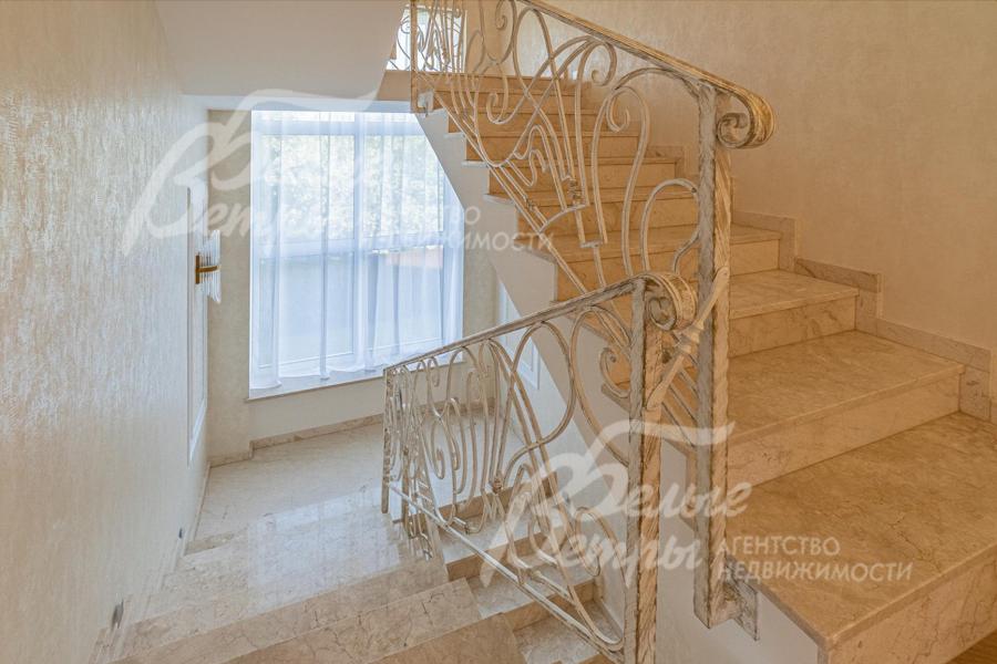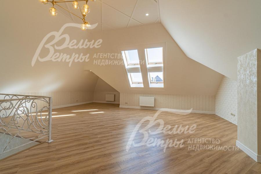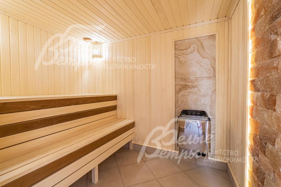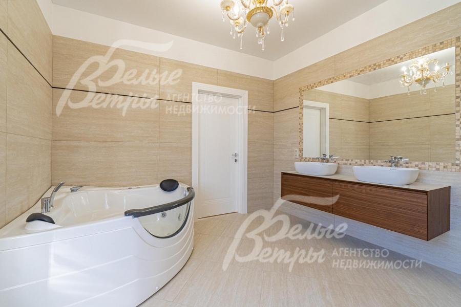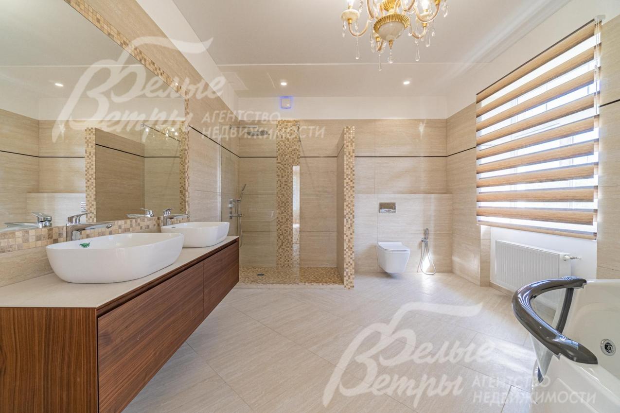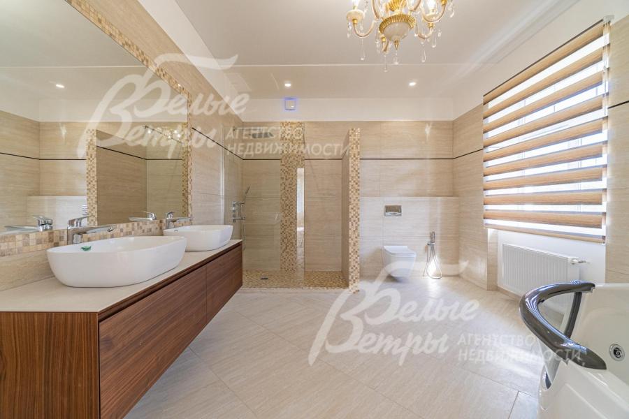 Описание внутренней отделки: отделка выполнена в современных мотивах, преимущественно в светлых тонах, с использованием дорогих материалов. На стенах декоративная штукатурка (Венецианка), обои с текстильными вставками, в санузлах - керамогранит. В сауне - вставки из гималайской соли. В мастер-спальне на стене декоративное панно из гипса. Полы: 1 этаж - керамогранит с водяным подогревом, 2 этаж - паркетная доска, мансарда - ламинат высокого класса. Лестница ж/б монолитная стандартной ширины, ступени мраморные CREMA MARFIL (месторождение камня - Италия) с подсветкой, поручни - художественная ковка. Потолки подвесные ГКЛ фигурные с различной подсветкой. В 2-х спальнях - натяжной потолок, в мастер-спальне - ГКЛ фигурный с различной подсветкой. Установлена вся сантехника GAPPO (немецкое качество). Все коммуникации разведены под ключ. Трубы REHAU, радиаторы стальные Kermi. Там, где окна от пола, установлены внутрипольные конвекторы. Э/э Legrand. Подоконники мраморные.