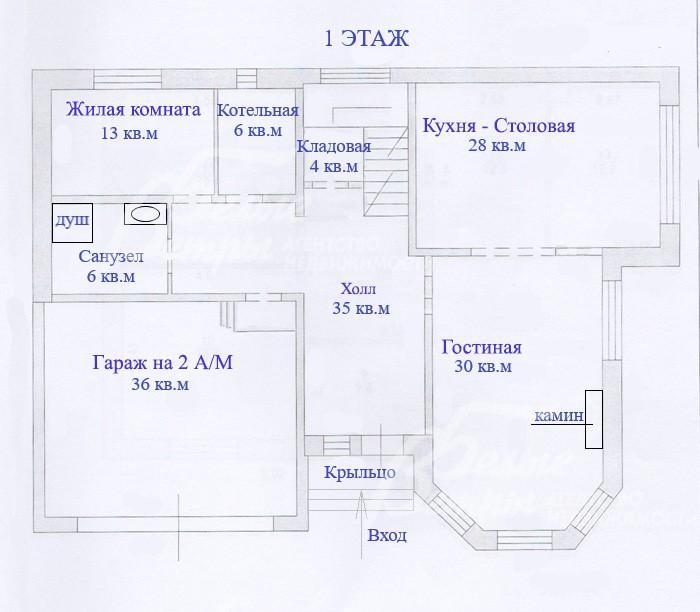 1-ый этаж: холл 35 кв.м, кухня-столовая 28 кв.м, гостиная 30 кв.м, санузел 6 кв.м, спальня 13 кв.м, кладовая 4 кв.м, гараж 36 кв.м, котельная 6 кв.м.
