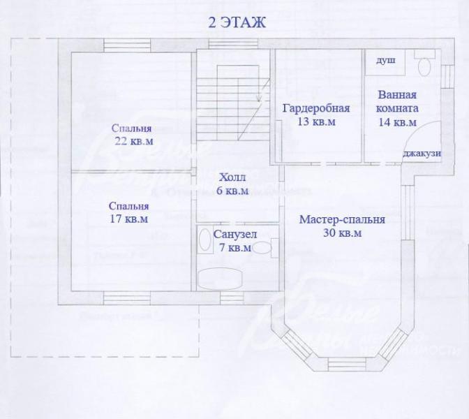 2-ой этаж: холл 6 кв.м, мастер-спальня 30 кв.м с гардеробной 13 кв.м и ванной комнатой 14 кв.м, спальня 17 кв.м, спальня 22 кв.м, санузел 7 кв.м.
