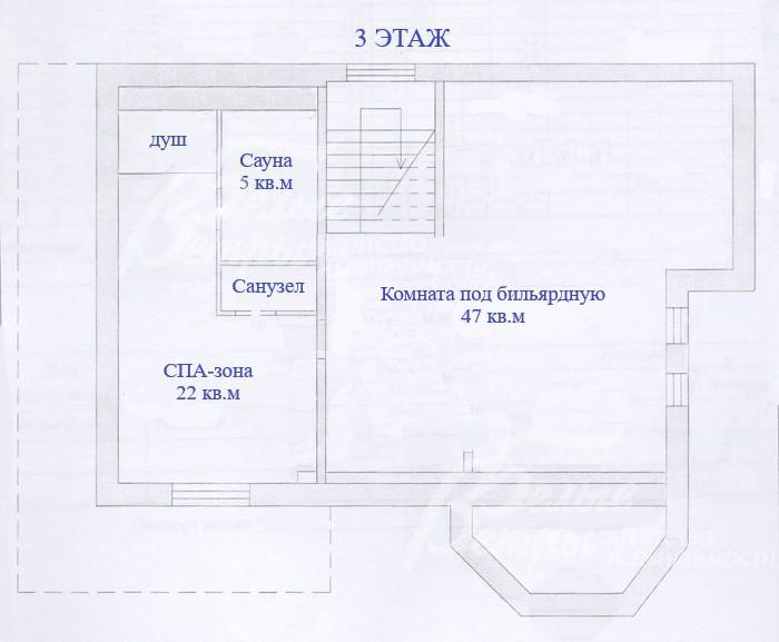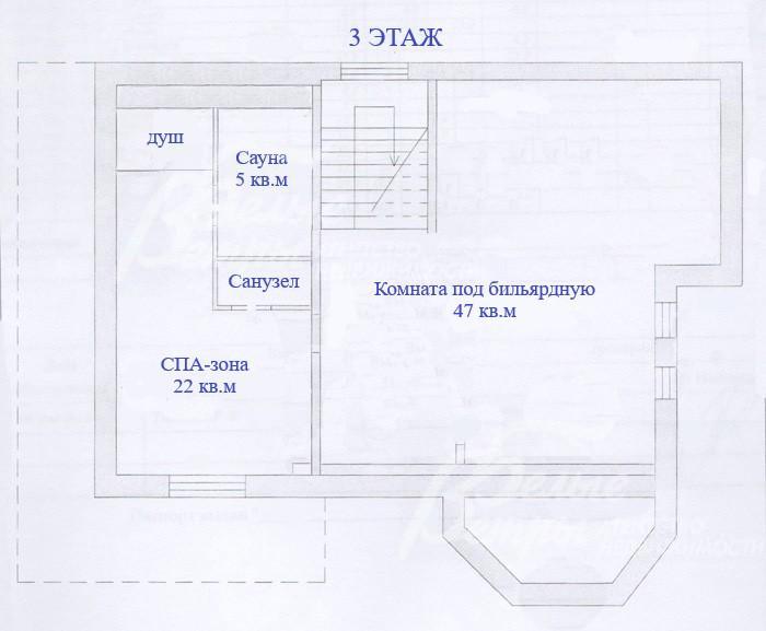 3-ий этаж: комната под бильярдную 47 кв.м, СПА-зона 22 кв.м с сауной 5 кв.м, душевой и санузлом.